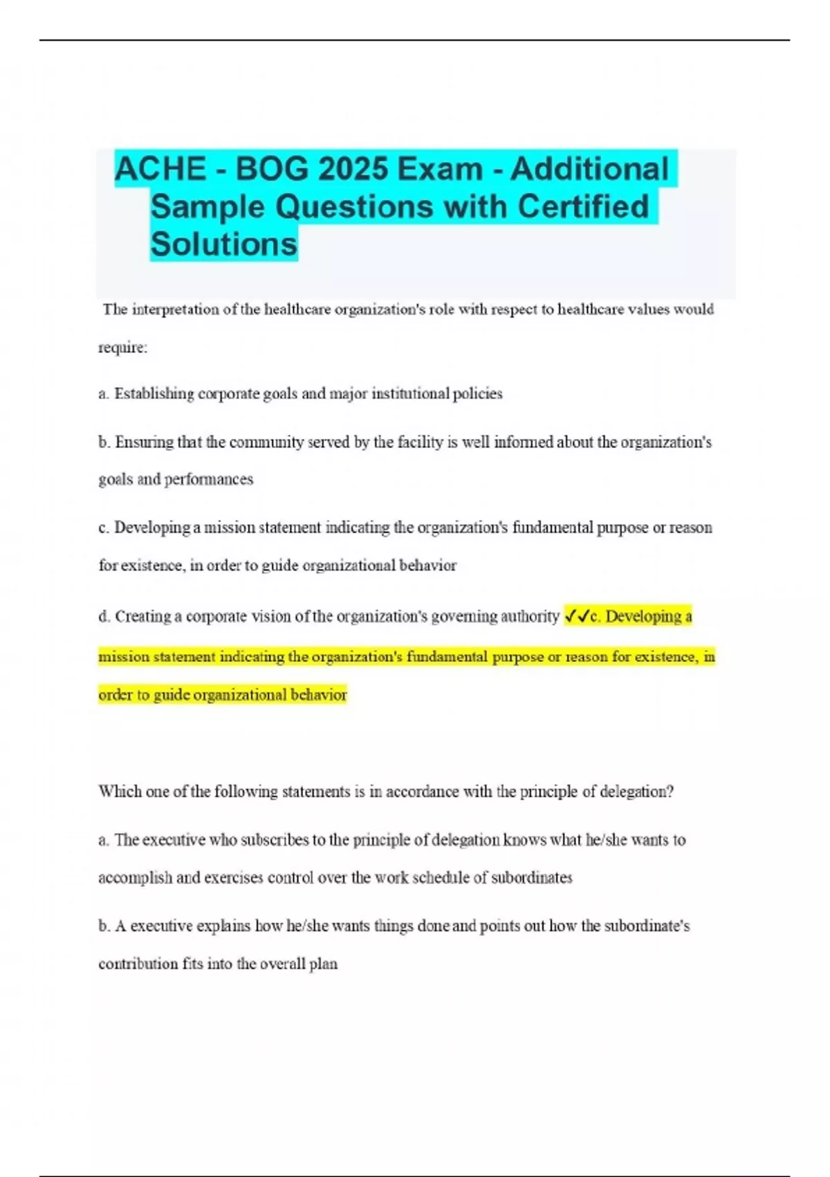 ACHE - BOG 2025 Exam - Additional Sample Questions with Certified Solutions The interpretation of the healthcare organization's role with respect to healthcare values would require: a. Establishing corporate goals and major institutional policies b. Ensuring that the community served by the facility is well informed about the organization's goals and performances c. Developing a mission statement indicating the organization's fundamental purpose or reason for existence, in order to guide organizational behavior d. Creating a corporate vision of the organization's governing authority c. Developing a mission statement indicating the organization's fundamental purpose or reason for existence, in order to guide organizational behavior Which one of the following statements is in accordance with the principle of delegation? a. The executive who subscribes to the principle of delegation knows what he/she wants to accomplish and exercises control over the work schedule of subordinates b. A executive explains how he/she wants things done and points out how the subordinate's contribution fits into the overall plan