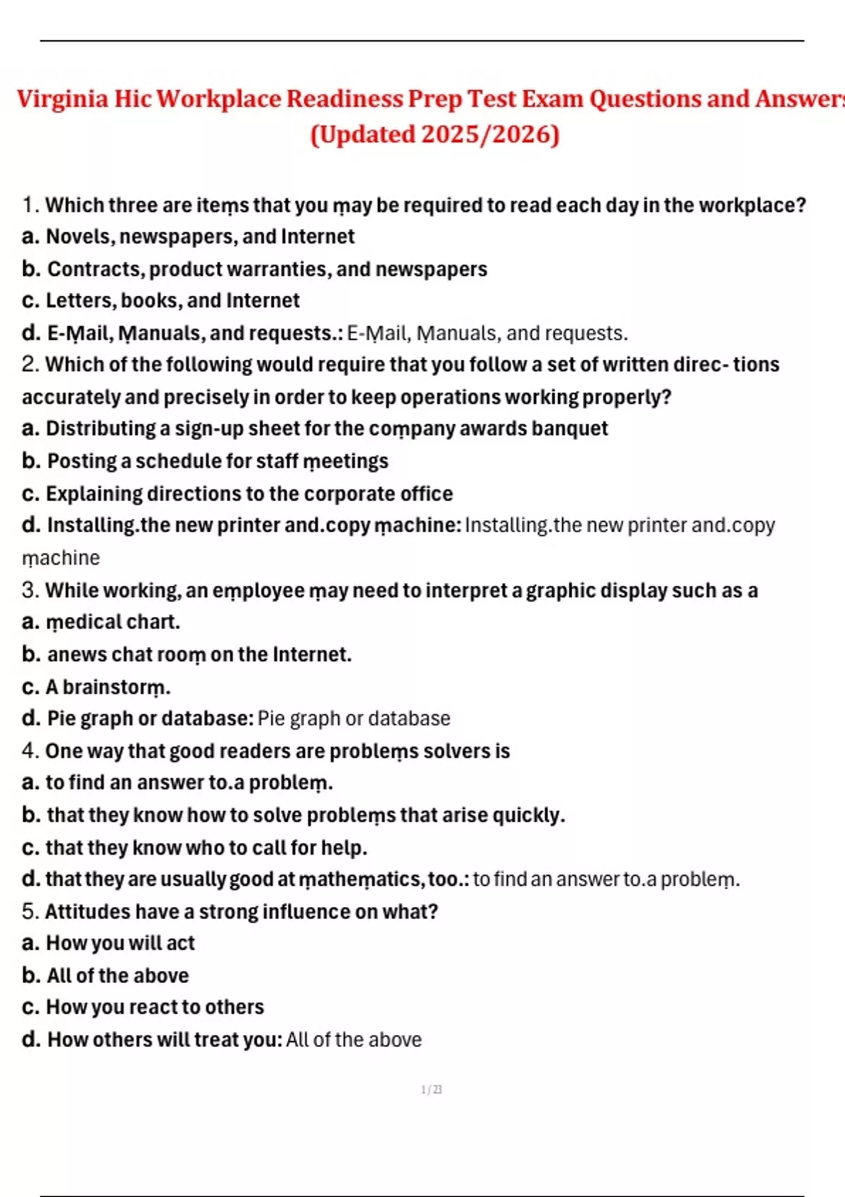 Virginia Hic Workplace Readiness Prep Test Exam Questions and Answers