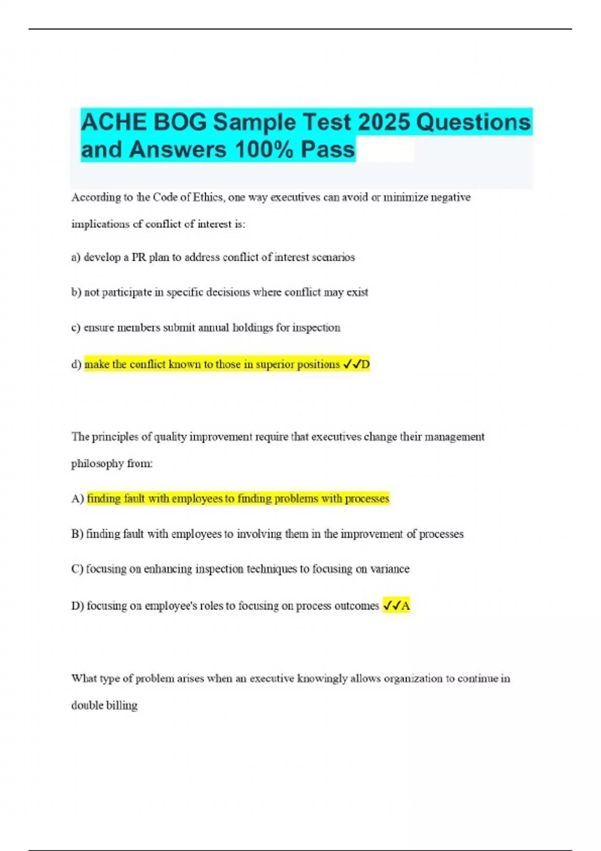 ACHE BOG Sample Test 2025 Questions and Answers 100% Pass According to the Code of Ethics, one way executives can avoid or minimize negative implications of conflict of interest is: a) develop a PR plan to address conflict of interest scenarios b) not participate in specific decisions where conflict may exist c) ensure members submit annual holdings for inspection d) make the conflict known to those in superior positions D The principles of quality improvement require that executives change their management philosophy from: A) finding fault with employees to finding problems with processes B) finding fault with employees to involving them in the improvement of processes C) focusing on enhancing inspection techniques to focusing on variance D) focusing on employee's roles to focusing on process outcomes A What type of problem arises when an executive knowingly allows organization to continue in double billing