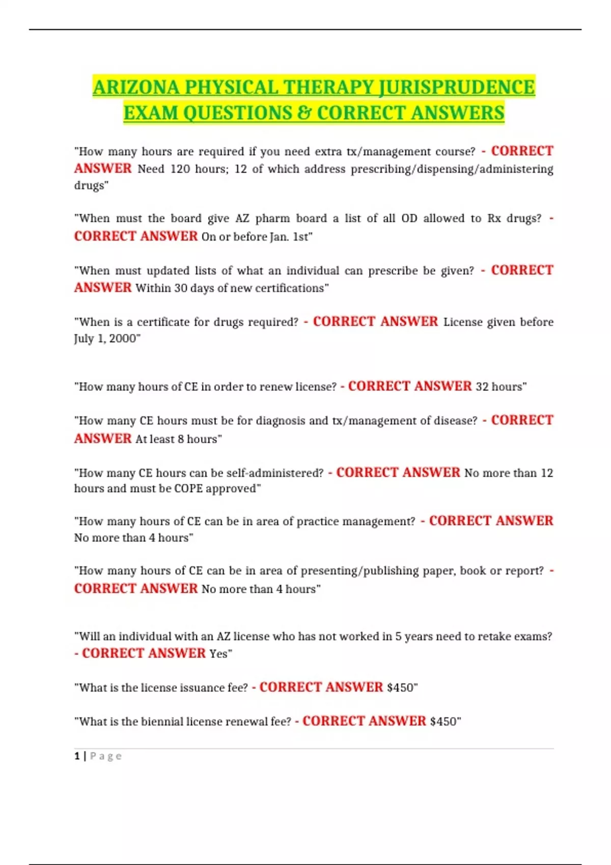 ARIZONA PHYSICAL THERAPY JURISPRUDENCE EXAM QUESTIONS & CORRECT ANSWERS "How many hours are required if you need extra tx/management course? - CORRECT ANSWER Need 120 hours; 12 of which address prescribing/dispensing/administering drugs" "When must the board give AZ pharm board a list of all OD allowed to Rx drugs? - CORRECT ANSWER On or before Jan. 1st" "When must updated lists of what an individual can prescribe be given? - CORRECT ANSWER Within 30 days of new certifications" "When is a certificate for drugs required? - CORRECT ANSWER License given before July 1, 2000" "How many hours of CE in order to renew license? - CORRECT ANSWER 32 hours" "How many CE hours must be for diagnosis and tx/management of disease? - CORRECT ANSWER At least 8 hours" "How many CE hours can be self-administered? - CORRECT ANSWER No more than 12 hours and must be COPE approved" "How many hours of CE can be in area of practice management? - CORRECT ANSWER No more than 4 hours" "How many hours of CE can be in area of presenting/publishing paper, book or report? - CORRECT ANSWER No more than 4 hours" "Will an individual with an AZ license who has not worked in 5 years need to retake exams? - CORRECT ANSWER Yes" "What is the license issuance fee? - CORRECT ANSWER $450" "What is the biennial license renewal fee? - CORRECT ANSWER $450" "What is the late renewal fee? - CORRECT ANSWER $200" "What is the application fee? - CORRECT ANSWER $150" "What is the fee for application for license by endorsement? - CORRECT ANSWER $300" "How much is a duplicate license fee? - CORRECT ANSWER $30 each" "How much for a certificate of special qualifications? - CORRECT ANSWER $20" "How much is pamphlet fee? - CORRECT ANSWER $5" "If you fail jurisprudence a second time, how long until you can retake? - CORRECT ANSWER 6 months" "How long to respond in writing to complain and notice of hearing until presumed guilty? - CORRECT ANSWER 20 days" "How long after hearing will written decision be given? - CORRECT ANSWER Within 20 days after hearing" "When may a prehearing be scheduled at request of licensee? - CORRECT ANSWER At least 10 days before hearing" "How long must a licensee maintain patient record after last contact with patient? - CORRECT ANSWER At least 6 years after last patient contact" "How long must a licensee maintain patient record after child turns 18? - CORRECT ANSWER At least 3 years ** or 6 years after child received care (whichever is later)" "When must a subpoena seeking medical or payment records be served to health care provider? - CORRECT ANSWER At least 10 days before the production date of on the subpoena" "What classifies as a newborn? - CORRECT ANSWER Infant under 30 days old" No - CORRECT ANSWER Does AZ issue temporary licenses?" "Arizona Jurisprudence Exam - CORRECT ANSWER $50" "Direct Access - CORRECT ANSWER Obtained in 1983 with no restrictions to access although PT's should know the appropriate referral process" "What are the Continuing Ed Requirements for PT's? - CORRECT ANSWER 20 CEU's; at least 10 hrs by an accredited medical PT to health care education program" "Continuing Ed Requirements PTA's - CORRECT ANSWER None" "How many CEU's does a licensee need if their initial license is for less than one year? - CORRECT ANSWER 10 CEU's for the initial compliance period" "Inservice Education CEU's - CORRECT ANSWER Category B; no more than 5 hrs (1 contact hr:1 ceu)" "Group study CEU's - CORRECT ANSWER Category B; no more than 5 hrs (2:1); at least 3 participants" "Physical Therapy Practice Management - CORRECT ANSWER Category C; no more than 5 hrs (1:1)" "Maximum number of CEU's in category & C - CORRECT ANSWER 10 hours" "How do PT aides function? - CORRECT ANSWER Under on-site supervision of PT" “What is the board composed of? - CORRECT ANSWER 5 ODs (practiced in AZ at least 3 years) and 2 Non-ODs" "How long do board members serve? - CORRECT ANSWER A staggered 4 year term" "How many consecutive terms can board members serve? - CORRECT ANSWER 2 consecutive terms" "How many regular meetings must the board have each year? - CORRECT ANSWER 6 regular meetings" "How many unexcused absences may cause removal of board member? - CORRECT ANSWER 2 consecutive unexcused absences" "How much of the board deposits go to state general fund? Board of optometry fund? - CORRECT ANSWER State general fund: 10% Board of optometry fund: 90%" "Oral steroids cannot be given longer than..? - CORRECT ANSWER Not be given longer than 7 days" "Who is not allowed to receive oral or schedule III medications? - CORRECT ANSWER Under 6 years old" "When will the board issue a pharmaceutical agent number? - CORRECT ANSWER If given initial license after June 30, 2000" "What percentage is required to pass the written exam? - CORRECT ANSWER 75%; must get a 50% or better on individual parts" "What percentage is required for practical exam if given? - CORRECT ANSWER At least a 75%" "What percentage must you get on NBEO? - CORRECT ANSWER 75% overall" "How many years must an optometrist work to apply for licensure under endorsement? - CORRECT ANSWER Continuously for 4 of the past 5 years" "When must the issuance fee be paid? - CORRECT ANSWER Within 60 days of successful completion of all components to get license or must start over" "When must you renew your license? - CORRECT ANSWER Every other year on birthday or within 30 days of birthday or subject to late fee" "When does license expire if not renewed? - CORRECT ANSWER If not renewed within 4 months after birthday" "Does the course required to prescribe pharmaceuticals count for CE? - CORRECT ANSWER Only 1 hour per day, up to 4 hours" "Does CPR certification count as CE? - CORRECT ANSWER 1 hour of CE" "What happens with CE hours during the biennial renewal period in which a licensee is first licensed? - CORRECT ANSWER Licensee shall obtain a prorated number of hours of approved CE for each month remaining in biennial renewal period." "How long must info on the OE tracker report for CE remain? - C