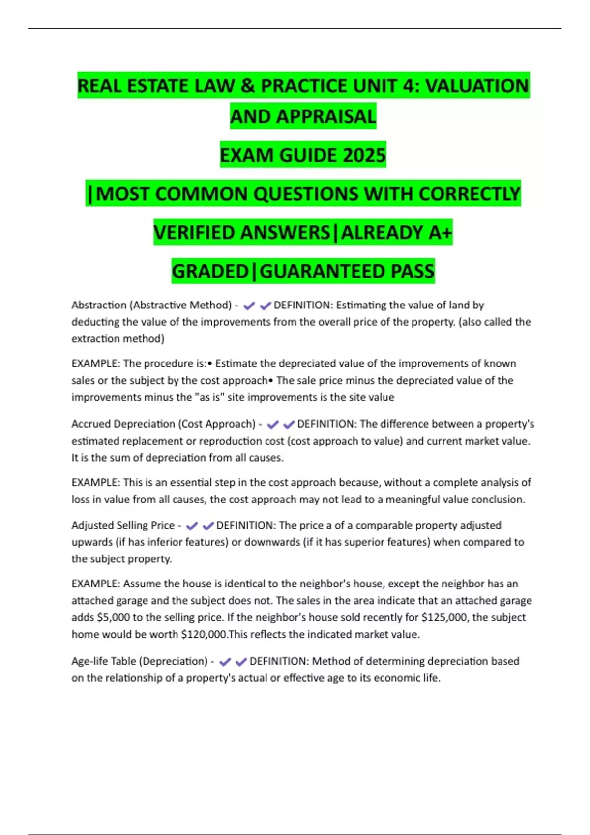 REAL ESTATE LAW & PRACTICE UNIT 4: VALUATION AND APPRAISAL Ultimate Exam Guide 2025 | Verified Answer Key | Guaranteed High Marks