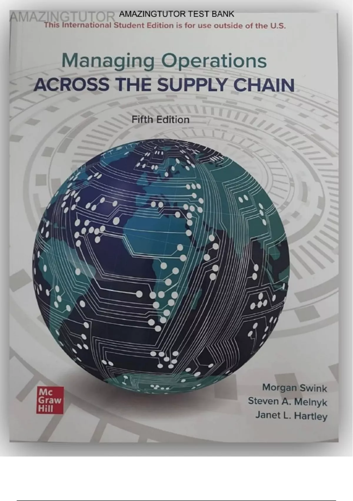 Test Bank for Managing Operations Across the Supply Chain 5e 5th Edition by Morgan Swink, Steven Melnyk, Janet L. Hartley and M. Bixby Cooper. Full Chapters test bank are included - Chapter 1 to 16 Part 1: SUPPLY CHAIN: A PERSPECTIVE FOR OPERATIONS MANAGEMENT Chapter 1: Introduction to Managing Operations Across the Supply Chain Chapter 2: Operations and Supply Chain Strategy Part 2: FOUNDATIONS OF OPERATIONS MANAGEMENT Chapter 3: Managing Processes and Capacity Chapter 3: Chapter Supplement: Process Mapping and Analysis Chapter 4: Product/Process Innovation Chapter 5: Manufacturing and Service Process Structures Chapter 6: Managing Quality Chapter 6: Chapter Supplement: Quality Improvement Tools Chapter 7: Managing Inventories Chapter 8: Lean Systems Part 3: INTEGRATING RELATIONSHIPS ACROSS THE SUPPLY CHAIN Chapter 9: Customer Service Management Chapter 10: Sourcing and Supply Management Chapter 11: Logistics Management Part 4: PLANNING FOR INTEGRATED OPERATIONS ACROSS THE SUPPLY CHAIN Chapter 12: Demand Planning: Forecasting and Demand Management Chapter 13: Sales and Operations Planning Chapter 14: Materials and Resource Requirements Planning @AMAZINGTUTOR TEST BANK