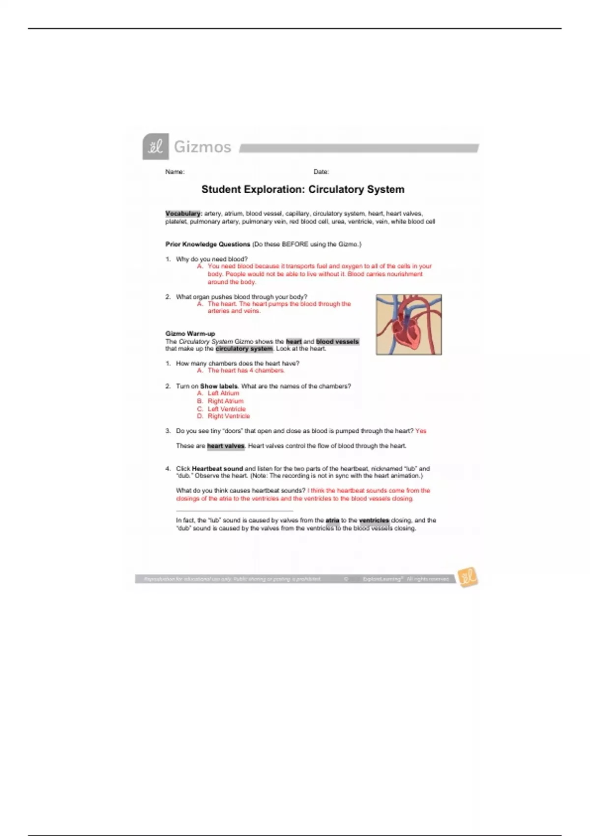 Vocabulary: artery, atrium, blood vessel, capillary, circulatory system, heart, heart valves,