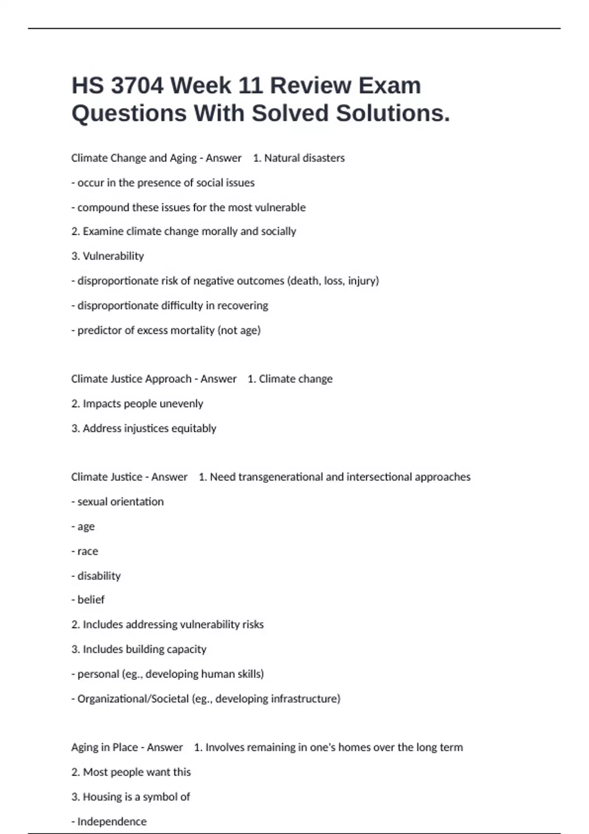Climate Change and Aging - Answer 1. Natural disasters - occur in the presence of social issues - compound these issues for the most vulnerable 2. Examine climate change morally and socially 3. Vulnerability - disproportionate risk of negative outcomes (death, loss, injury) - disproportionate difficulty in recovering - predictor of excess mortality (not age) Climate Justice Approach - Answer 1. Climate change 2. Impacts people unevenly 3. Address injustices equitably Climate Justice - Answer 1. Need transgenerational and intersectional approaches - sexual orientation - age - race - disability - belief 2. Includes addressing vulnerability risks 3. Includes building capacity - personal (eg., developing human skills) - Organizational/Societal (eg., developing infrastructure) Aging in Place - Answer 1. Involves remaining in one's homes over the long term 2. Most people want this 3. Housing is a symbol of - Independence - Point for family gatherings - Source of pleasant memories - Link to neighbours and surrounding community