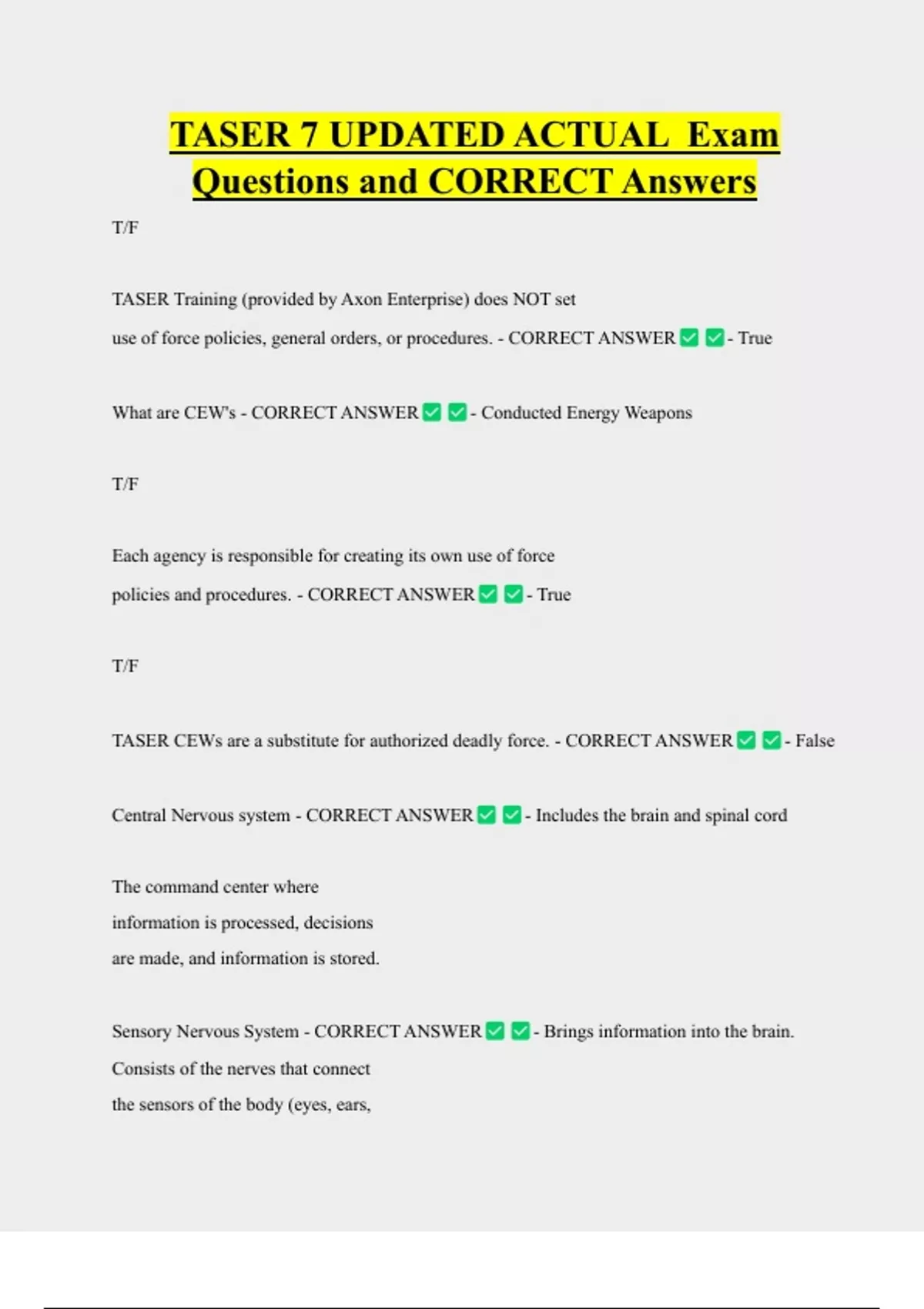 TASER 7 UPDATED ACTUAL Exam Questions and CORRECT Answers T/F TASER Training (provided by Axon Enterprise) does NOT set use of force policies, general orders, or procedures. - CORRECT ANSWER What are CEW's - CORRECT ANSWER T/F - Conducted Energy Weapons