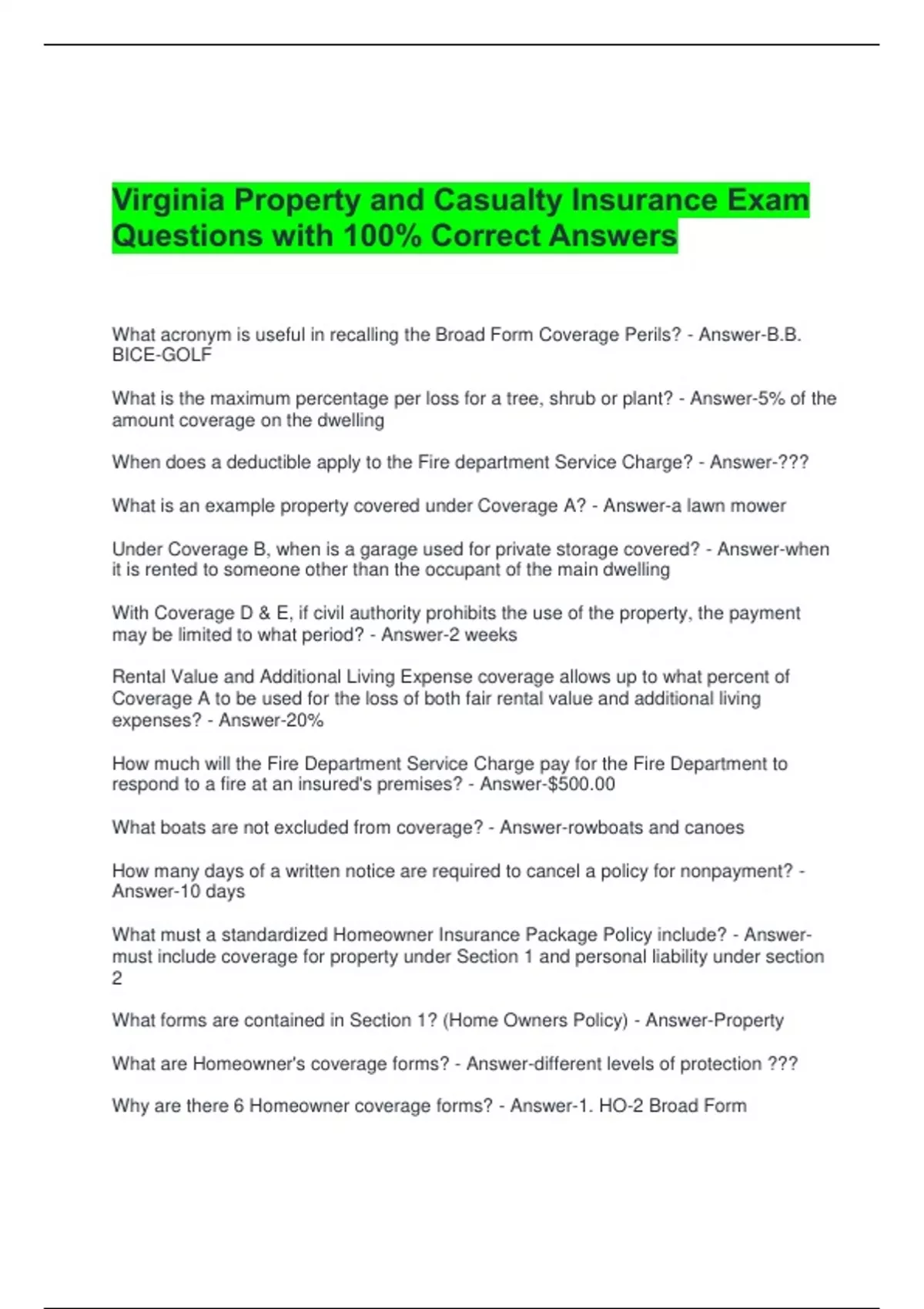 What acronym is useful in recalling the Broad Form Coverage Perils? - Answer-B.B.