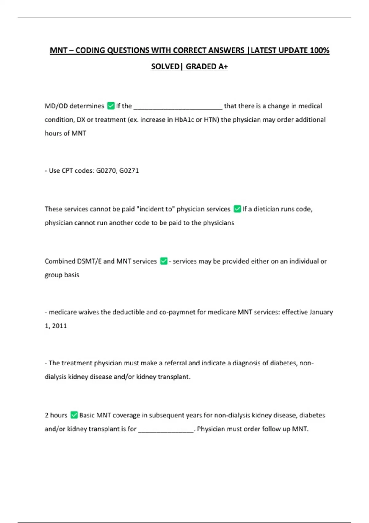 - medicare waives the deductible and co-paymnet for medicare MNT services: effective January
