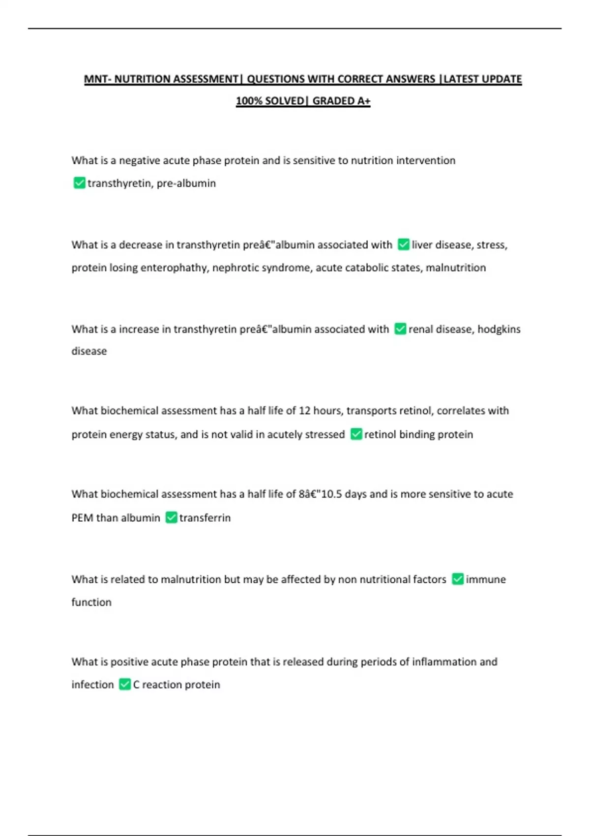 What biochemical assessment has a half life of 12 hours, transports retinol, correlates with