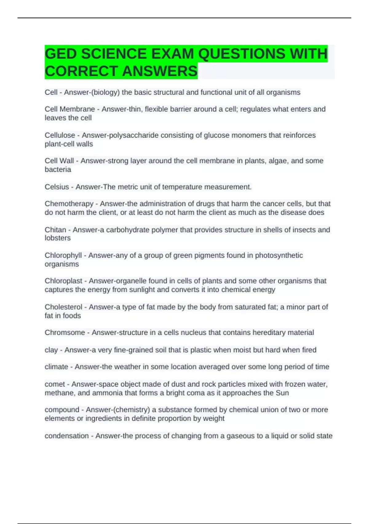 GED SCIENCE EXAM QUESTIONS WITH CORRECT ANSWERS Cell - Answer-(biology) the basic structural and functional unit of all organisms Cell Membrane - Answer-thin, flexible barrier around a cell; regulates what enters and leaves the cell Cellulose - Answer-polysaccharide consisting of glucose monomers that reinforces plant-cell walls Cell Wall - Answer-strong layer around the cell membrane in plants, algae, and some bacteria Celsius - Answer-The metric unit of temperature measurement. Chemotherapy - Answer-the administration of drugs that harm the cancer cells, but that do not harm the client, or at least do not harm the client as much as the disease does Chitan - Answer-a carbohydrate polymer that provides structure in shells of insects and lobsters Chlorophyll - Answer-any of a group of green pigments found in photosynthetic organisms Chloroplast - Answer-organelle found in cells of plants and some other organisms that captures the energy from sunlight and converts it into chemical energy Cholesterol - Answer-a type of fat made by the body from saturated fat; a minor part of fat in foods Chromsome - Answer-structure in a cells nucleus that contains hereditary material clay - Answer-a very fine-grained soil that is plastic when moist but hard when fired climate - Answer-the weather in some location averaged over some long period of time comet - Answer-space object made of dust and rock particles mixed with frozen water, methane, and ammonia that forms a bright coma as it approaches the Sun compound - Answer-(chemistry) a substance formed by chemical union of two or more elements or ingredients in definite proportion by weight condensation - Answer-the process of changing from a gaseous to a liquid or s