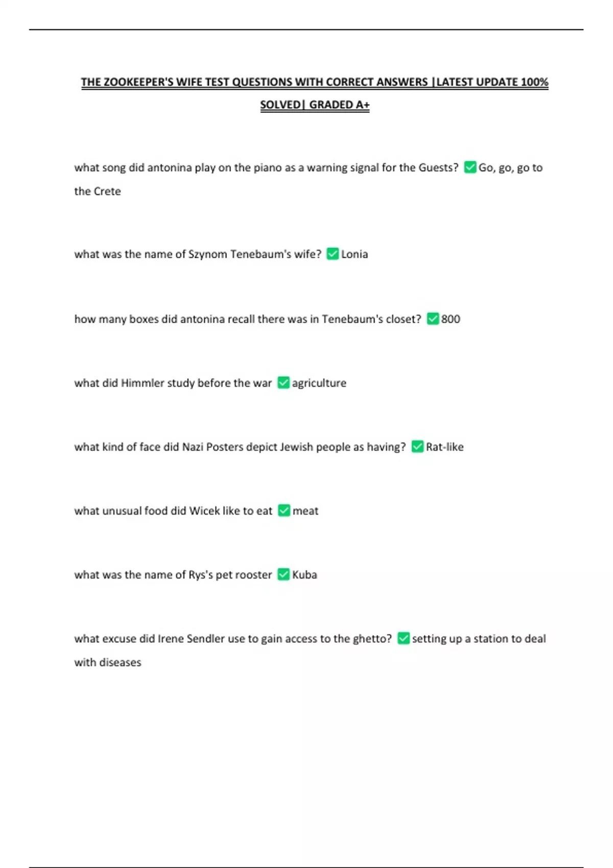 THE ZOOKEEPER'S WIFE TEST QUESTIONS WITH CORRECT ANSWERS |LATEST UPDATE 100% SOLVED| GRADED A+
