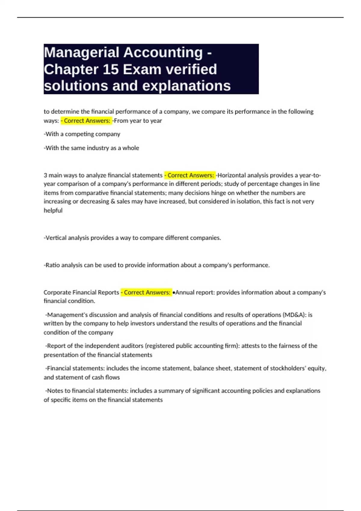 Corporate Financial Reports - Correct Answers: •Annual report: provides information about a company's