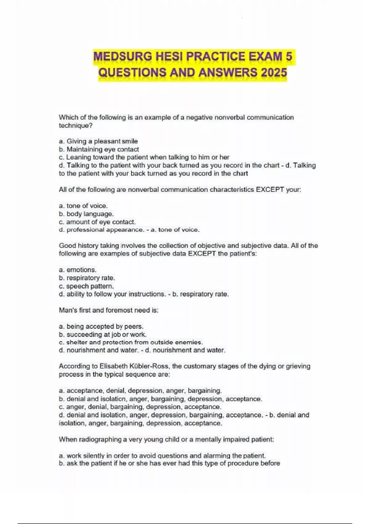 MEDSURG HESI PRACTICE EXAM 5 QUESTIONS AND ANSWERS 2025 Which of the following is an example of a negative nonverbal communication technique? a. Giving a pleasant smile b. Maintaining eye contact c. Leaning toward the patient when talking to him or her d. Talking to the patient with your back turned as you record in the chart - d. Talking to the patient with your back turned as you record in the chart All of the following are nonverbal communication characteristics EXCEPT your: a. tone of voice. b. body language. c. amount of eye contact. d. professional appearance. - a. tone of voice.
