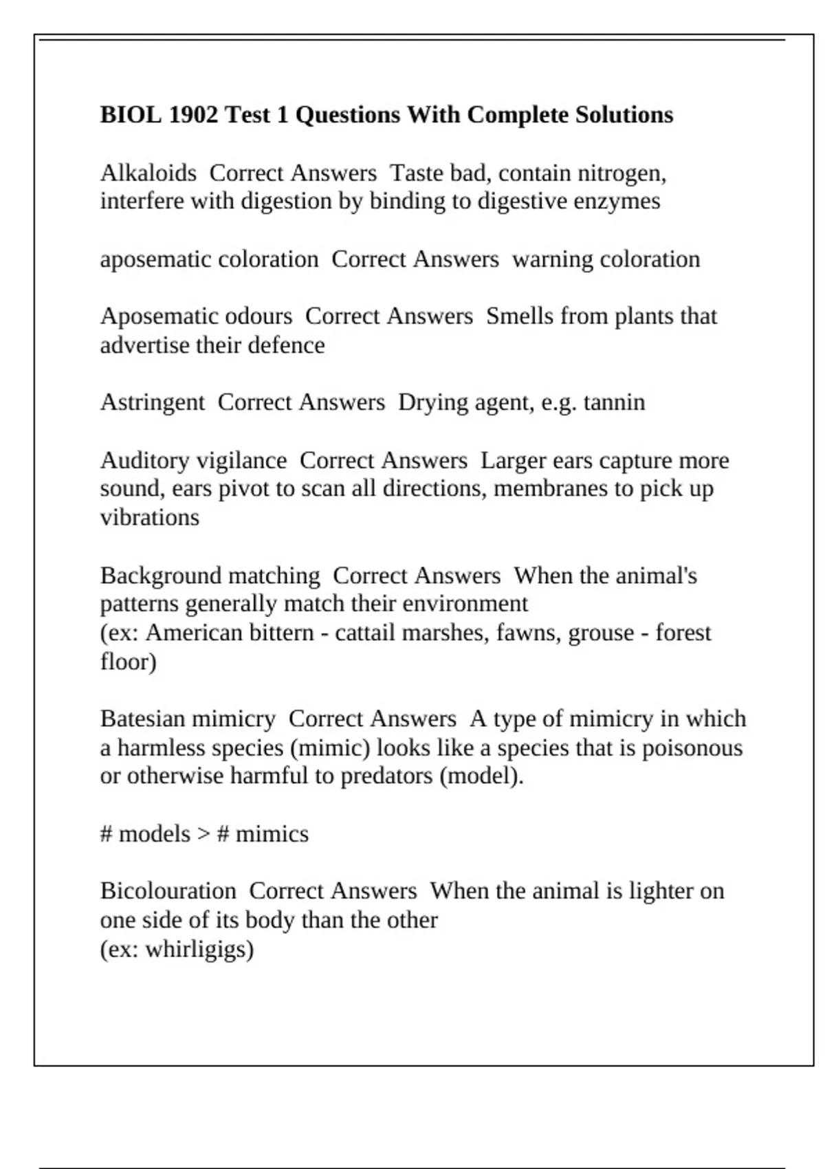 BIOL 1902 Test 1 Questions With Complete Solutions