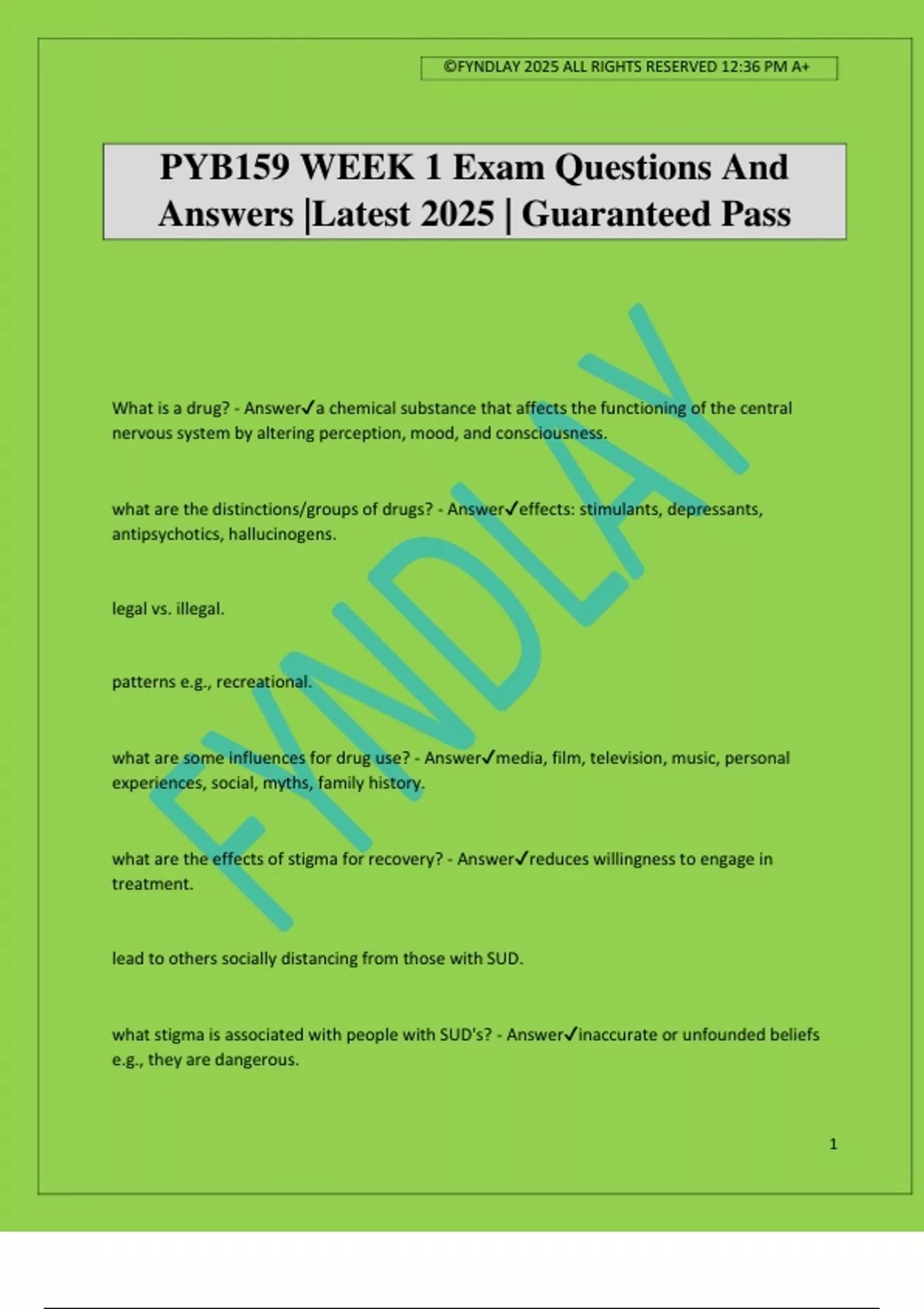 ©FYNDLAY 2025 ALL RIGHTS RESERVED 12:36 PM A+ 1 PYB159 WEEK 1 Exam Questions And Answers |Latest 2025 | Guaranteed Pass What is a drug? - Answera chemical substance that affects the functioning of the central nervous system by altering perception, mood, and consciousness. what are the distinctions/groups of drugs? - Answereffects: stimulants, depressants, antipsychotics, hallucinogens. legal vs. illegal. patterns e.g., recreational. what are some influences for drug use? - Answermedia, film, television, music, personal experiences, social, myths, family history. what are the effects of stigma for recovery? - Answerreduces willingness to engage in treatment. lead to others socially distancing from those with SUD. what stigma is associated with people with SUD's? - Answerinaccurate or unfounded beliefs e.g., they are dangerous.