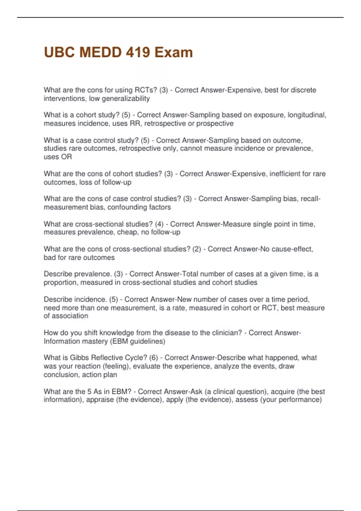 What are the cons for using RCTs? (3) - Correct Answer-Expensive, best for discrete interventions, low generalizability What is a cohort study? (5) - Correct Answer-Sampling based on exposure, longitudinal, measures incidence, uses RR, retrospective or prospective What is a case control study? (5) - Correct Answer-Sampling based on outcome, studies rare outcomes, retrospective only, cannot measure incidence or prevalence, uses OR What are the cons of cohort studies? (3) - Correct Answer-Expensive, inefficient for rare outcomes, loss of follow-up What are the cons of case control studies? (3) - Correct Answer-Sampling bias, recallmeasurement bias, confounding factors What are cross-sectional studies? (4) - Correct Answer-Measure single point in time, measures prevalence, cheap, no follow-up What are the cons of cross-sectional studies? (2) - Correct Answer-No cause-effect, bad for rare outcomes Describe prevalence. (3) - Correct Answer-Total number of cases at a given time, is a proportion, measured in cross-sectional studies and cohort studies
