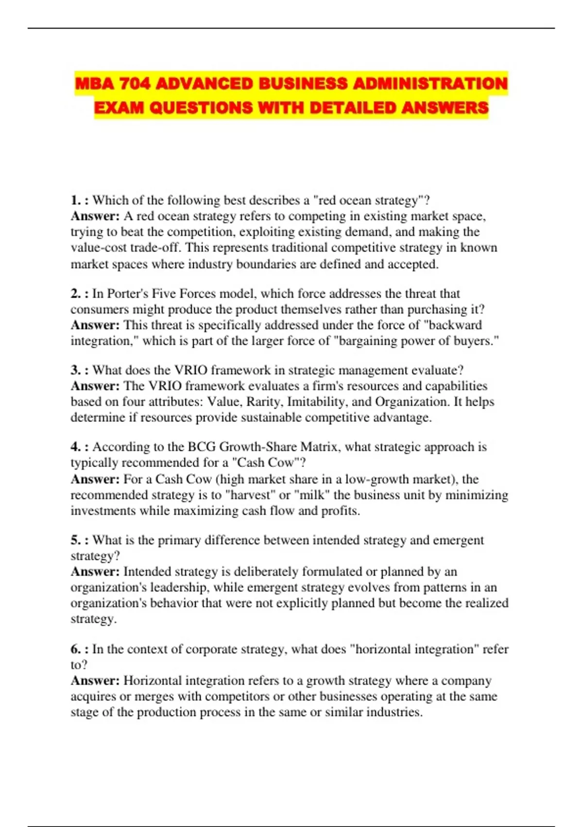 MBA 704 ADVANCED BUSINESS ADMINISTRATION EXAM QUESTIONS WITH DETAILED ANSWERS