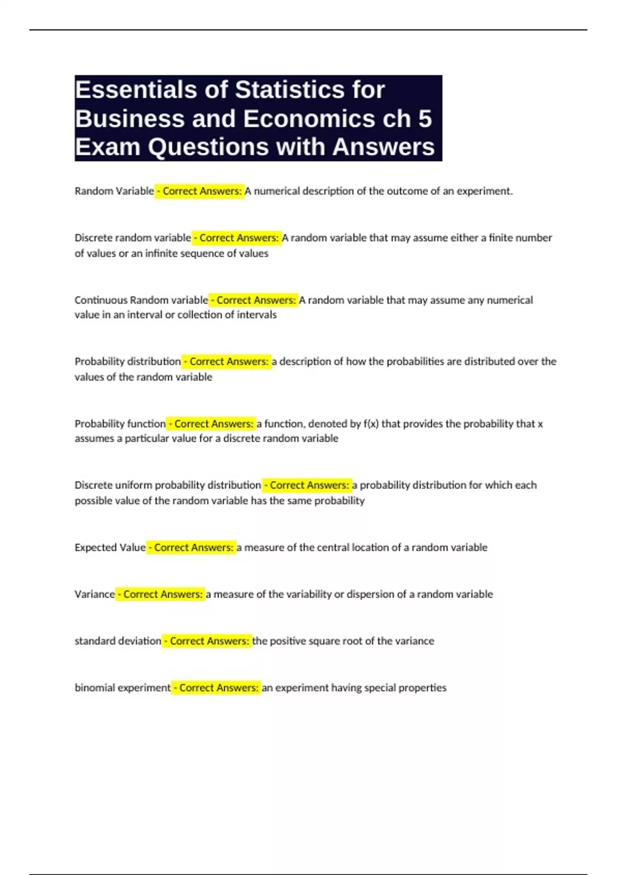 Variance - Correct Answers: a measure of the variability or dispersion of a random variable