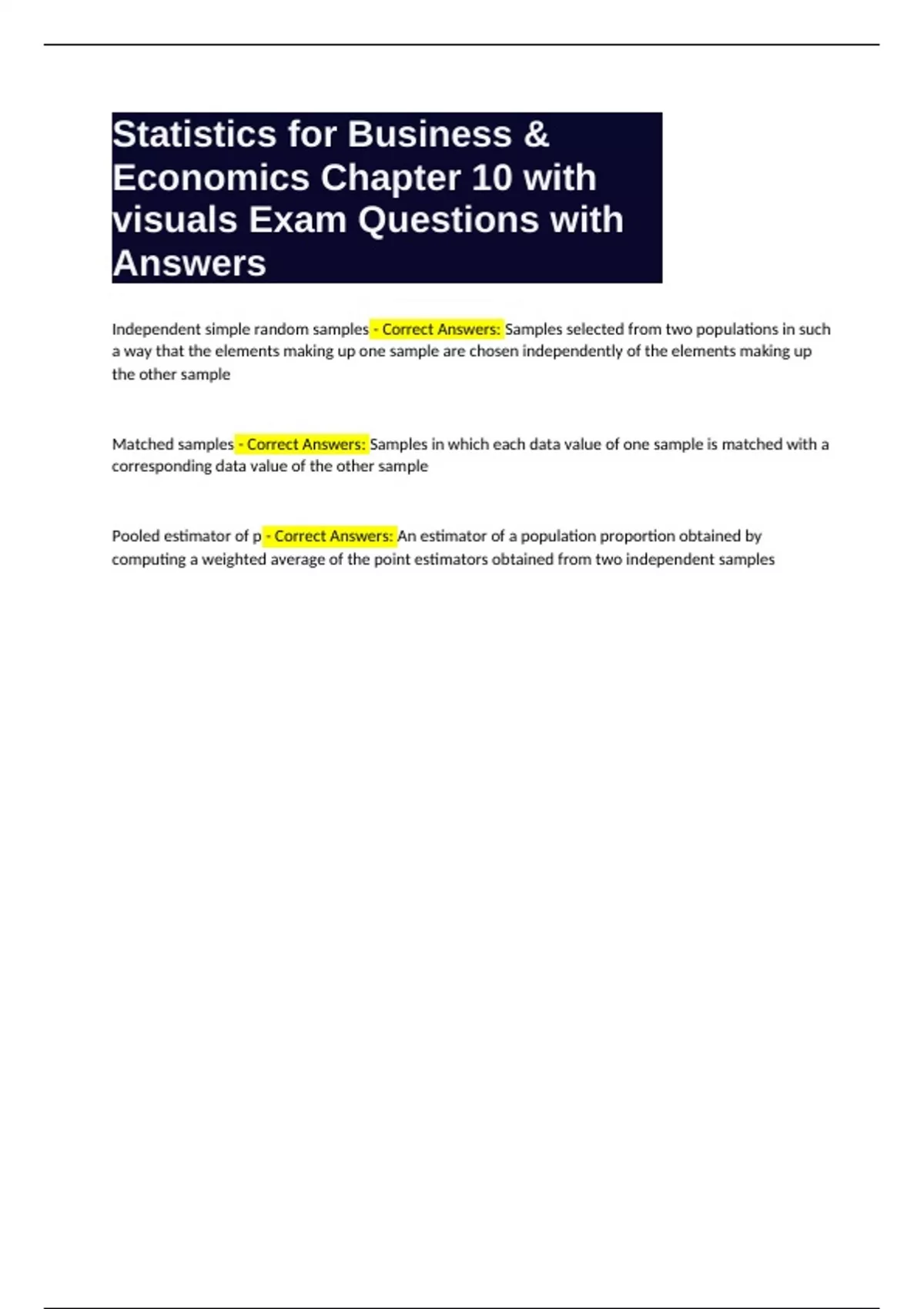 Independent simple random samples - Correct Answers: Samples selected from two populations in such
