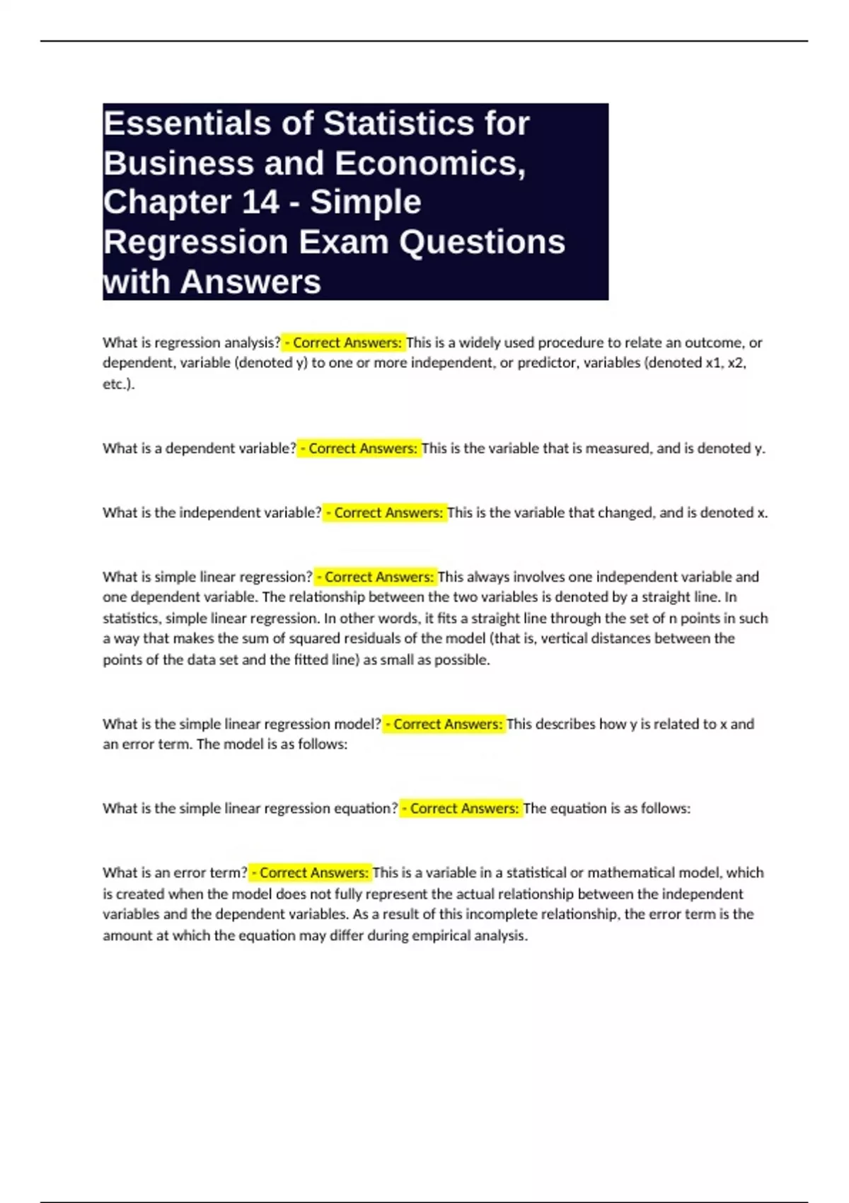 Essentials of Statistics for Business and Economics, Chapter 14 - Simple Regression Exam Questions with Answers What is regression analysis? - Correct Answers: This is a widely used procedure to relate an outcome, or dependent, variable (denoted y) to one or more independent, or predictor, variables (denoted x1, x2, etc.). What is a dependent variable? - Correct Answers: This is the variable that is measured, and is denoted y. What is the independent variable? - Correct Answers: This is the variable that changed, and is denoted x. What is simple linear regression? - Correct Answers: This always involves one independent variable and one dependent variable. The relationship between the two variables is denoted by a straight line. In statistics, simple linear regression. In other words, it fits a straight line through the set of n points in such a way that makes the sum of squared residuals of the model (that is, vertical distances between the points of the data set and the fitted line) as small as possible. What is the simple linear regression model? - Correct Answers: This describes how y is related to x and an error term. The model is as follows: What is the simple linear regression equation? - Correct Answers: The equation is as follows: What is an error term? - Correct Answers: This is a variable in a statistical or mathematical model, which is created when the model does not fully represent the actual relationship between the independent variables and the dependent variables. As a result of this incomplete relationship, the error term is the amount at which the equation may differ during empirical analysis. What is a positive linear relationship? - Correct Answers: This is when the slope of β1 is positive and slopes up. What is a negative linear relationship? - Correct Answers: This is when the slope of β1 is negative and slopes down. What does the slope of a simple regression look like when there is no relationship? - Correct Answers: In this situation, the line is perfectly horizontal. What is the estimated simple linear regression equation? - Correct Answers: The equation is as follows: What is the coefficient of determination? - Correct Answers: In a simple linear regression with only one independent variable, this is the square of the coefficient of correlation. It is represented by the term r2. The equation is as follows: What is a t-value? - Correct Answers: This measures the size of the difference relative to the variation in your sample data. Put another way, it is simply the calculated difference represented in units of standard error, AKA, it equals the coefficient divided by the standard error. The great this value (it can be either positive or negative), the greater the evidence against the null hypothesis that there is no significant difference. The closer it is to 0, the more likely there isn't a significant difference. What is the Confidence Interval for the mean of y? - Correct Answers: This is calculated as: How do you calculate the confidence interval for E(yp)? - Correct Answers: This is calculated as follows: