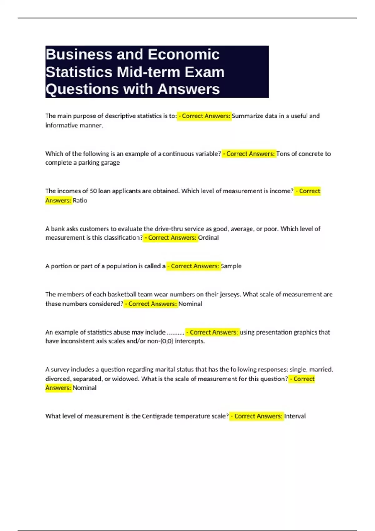 The main purpose of descriptive statistics is to: - Correct Answers: Summarize data in a useful and