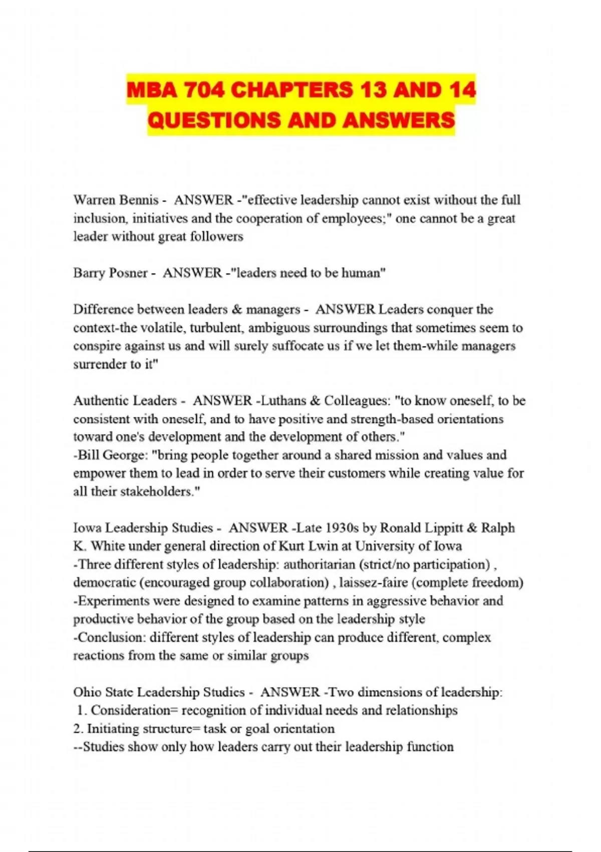 MBA 704 CHAPTERS 13 AND 14 QUESTIONS AND ANSWERS