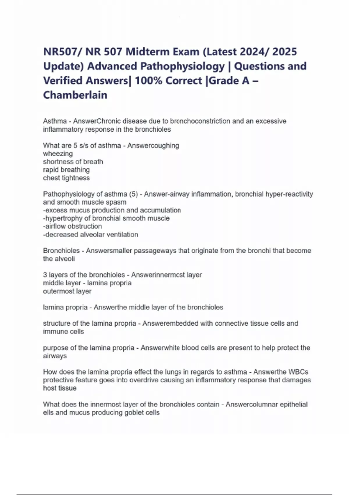 NR507/ NR 507 Midterm Exam (Latest 2024/ 2025 Update) Advanced Pathophysiology | Questions and Verified Answers| 100% Correct |Grade A – Chamberlain Asthma - AnswerChronic disease due to bronchoconstriction and an excessive inflammatory response in the bronchioles What are 5 s/s of asthma - Answercoughing wheezing shortness of breath rapid breathing chest tightness Pathophysiology of asthma (5) - Answer-airway inflammation, bronchial hyper-reactivity and smooth muscle spasm -excess mucus production and accumulation -hypertrophy of bronchial smooth muscle -airflow obstruction -decreased alveolar ventilation Bronchioles - Answersmaller passageways that originate from the bronchi that become the alveoli 3 layers of the bronchioles - Answerinnermost layer middle layer - lamina propria outermost layer lamina propria - Answerthe middle layer of the bronchioles structure of the lamina propria - Answerembedded with connective tissue cells and immune cells purpose of the lamina propria - Answerwhite blood cells are present to help protect the airways How does the lamina propria effect the lungs in regards to asthma - Answerthe WBCs protective feature goes into overdrive causing an inflammatory response that damages host tissue What does the innermost layer of the bronchioles contain - Answercolumnar epithelial ells and mucus producing goblet cells What does the outermost layer of the bronchioles contain - Answersmooth muscle cells