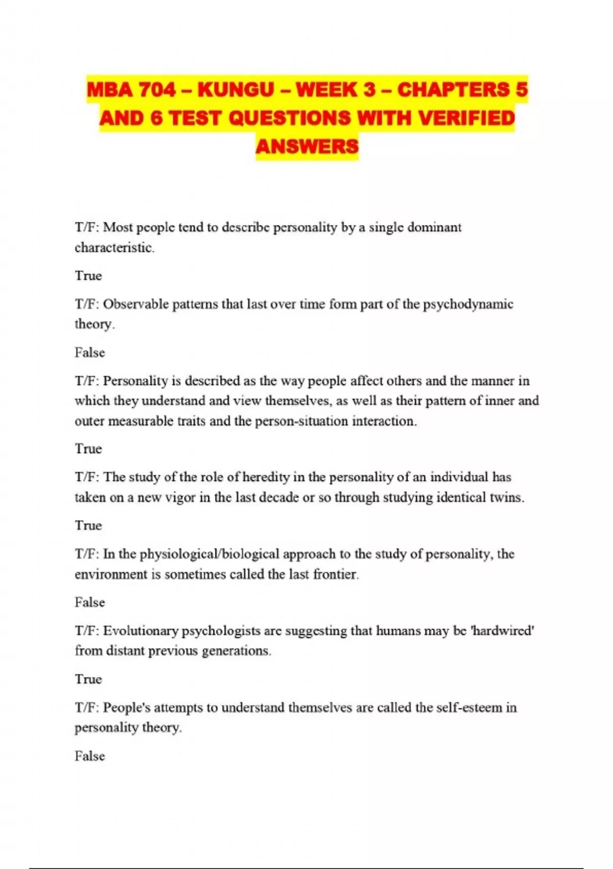 MBA 704 – KUNGU – WEEK 3 – CHAPTERS 5 AND 6 TEST QUESTIONS WITH VERIFIED ANSWERS....