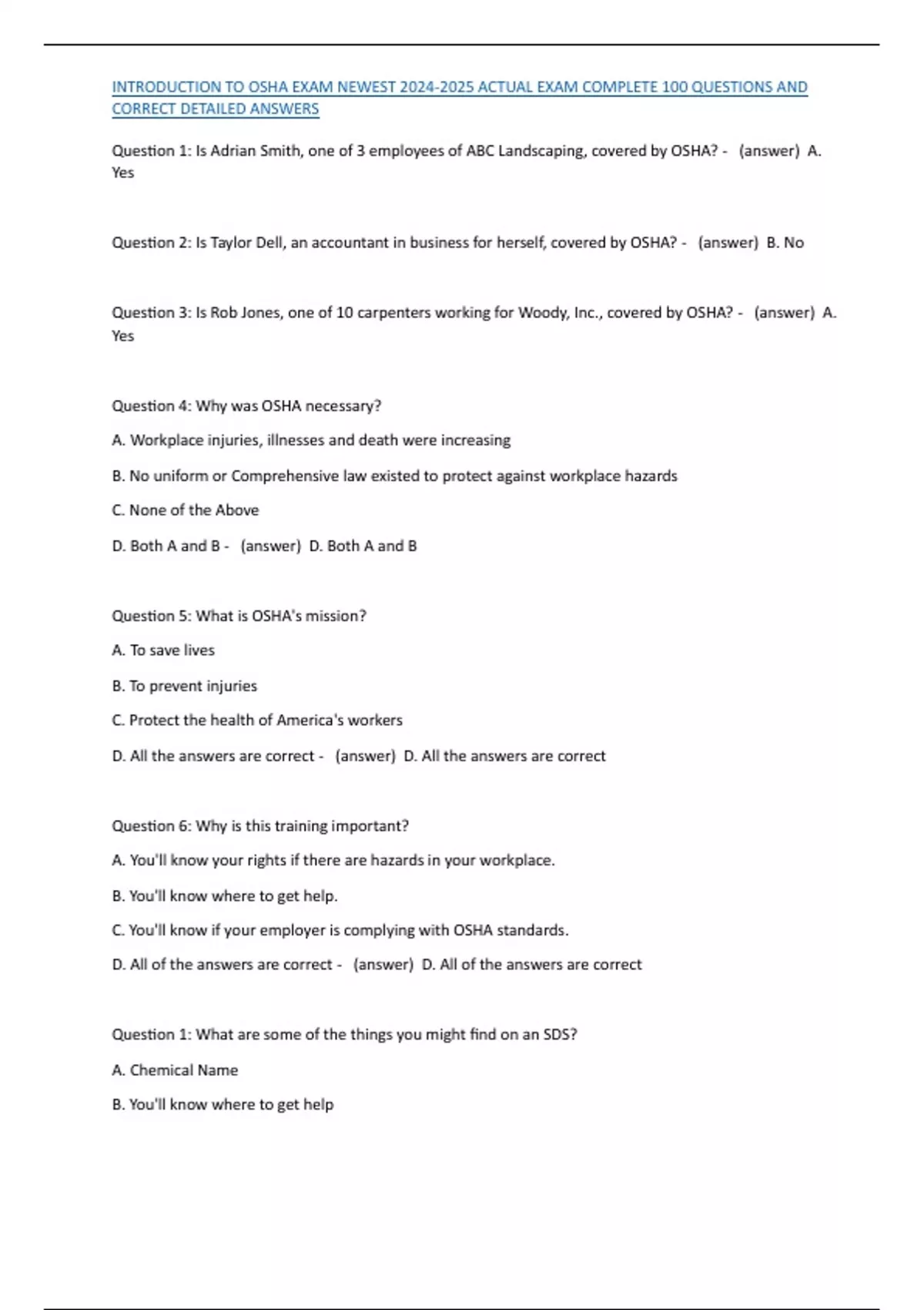 Question 1: Is Adrian Smith, one of 3 employees of ABC Landscaping, covered by OSHA? - (answer) A.