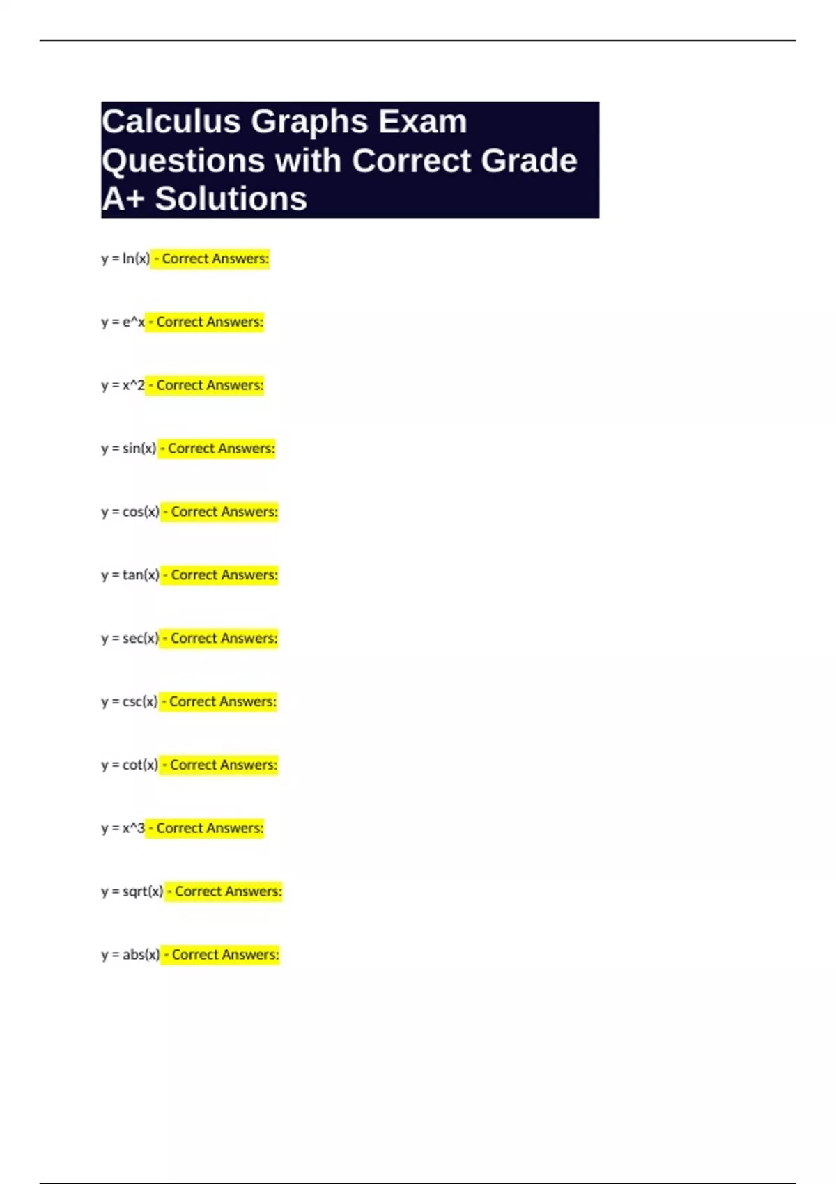 Calculus Graphs Exam Questions with Correct Grade A+ Solutions y = ln(x) - Correct Answers: y = e^x - Correct Answers: y = x^2 - Correct Answers: y = sin(x) - Correct Answers: y = cos(x) - Correct Answers: y = tan(x) - Correct Answers: y = sec(x) - Correct Answers: y = csc(x) - Correct Answers: y = cot(x) - Correct Answers: y = x^3 - Correct Answers: y = sqrt(x) - Correct Answers: y = abs(x) - Correct Answers: y = 1/x - Correct Answers: y = 3sqrt(x) - Correct Answers: