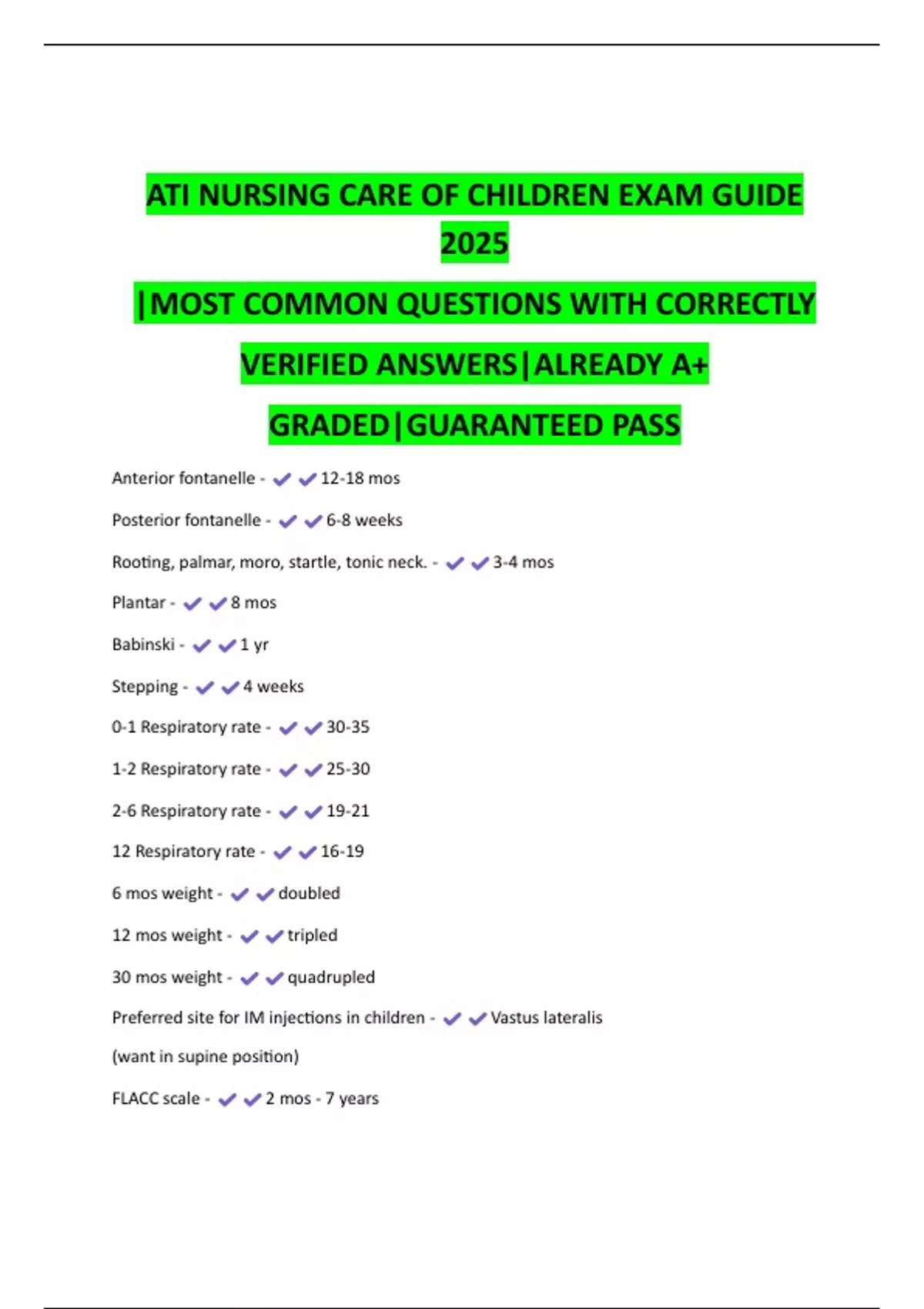 Boost your grades with this ATI NURSING CARE OF CHILDREN study guide featuring accurate, verified answers and the most recent quizzes. Pass guaranteed with A+ quality!
