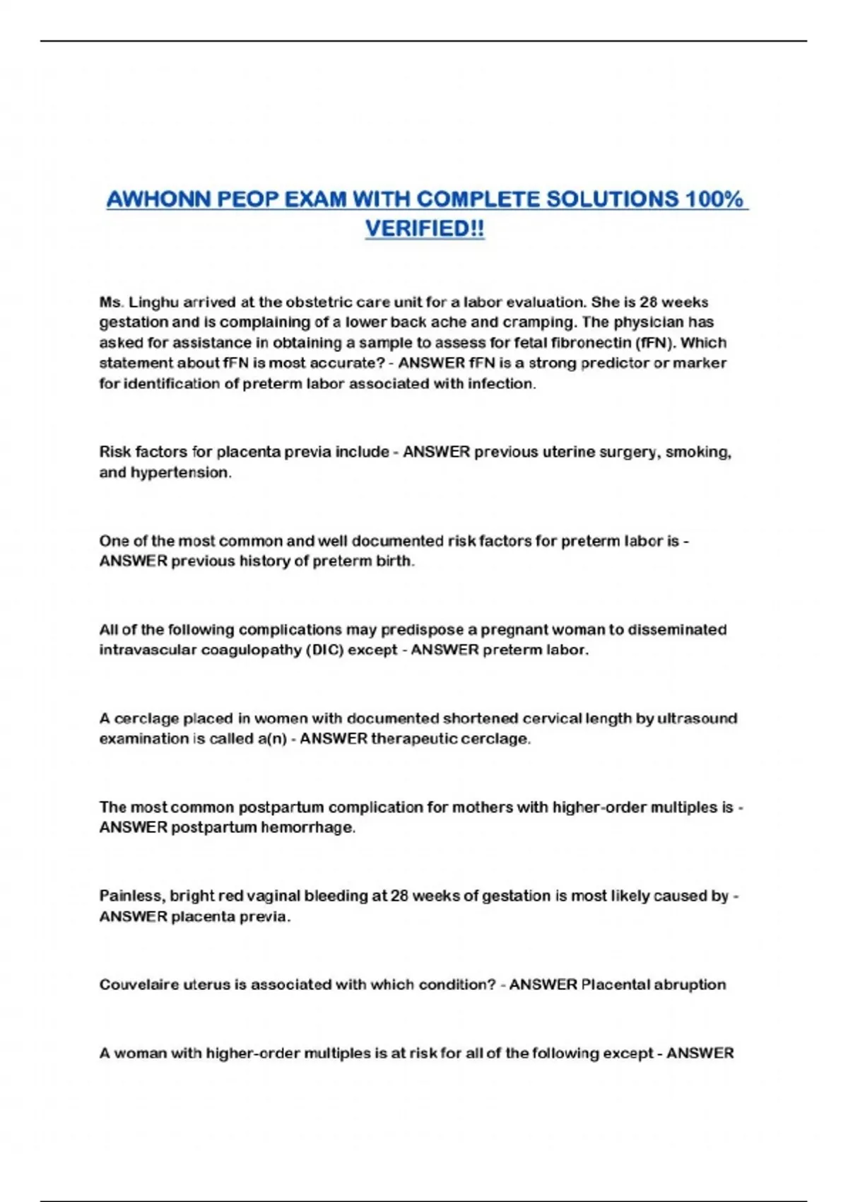 AWHONN PEOP EXAM WITH COMPLETE SOLUTIONS 100% VERIFIED!!...