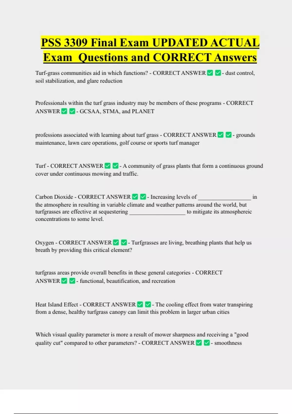 PSS 3309 Final Exam UPDATED ACTUAL Exam Questions and CORRECT Answers Turf-grass communities aid in which functions? - CORRECT ANSWER soil stabilization, and glare reduction - dust control, Professionals within the turf grass industry may be members of these programs - CORRECT ANSWER - GCSAA, STMA, and PLANET professions associated with learning about turf grass - CORRECT ANSWER maintenance, lawn care operations, golf course or sports turf manager