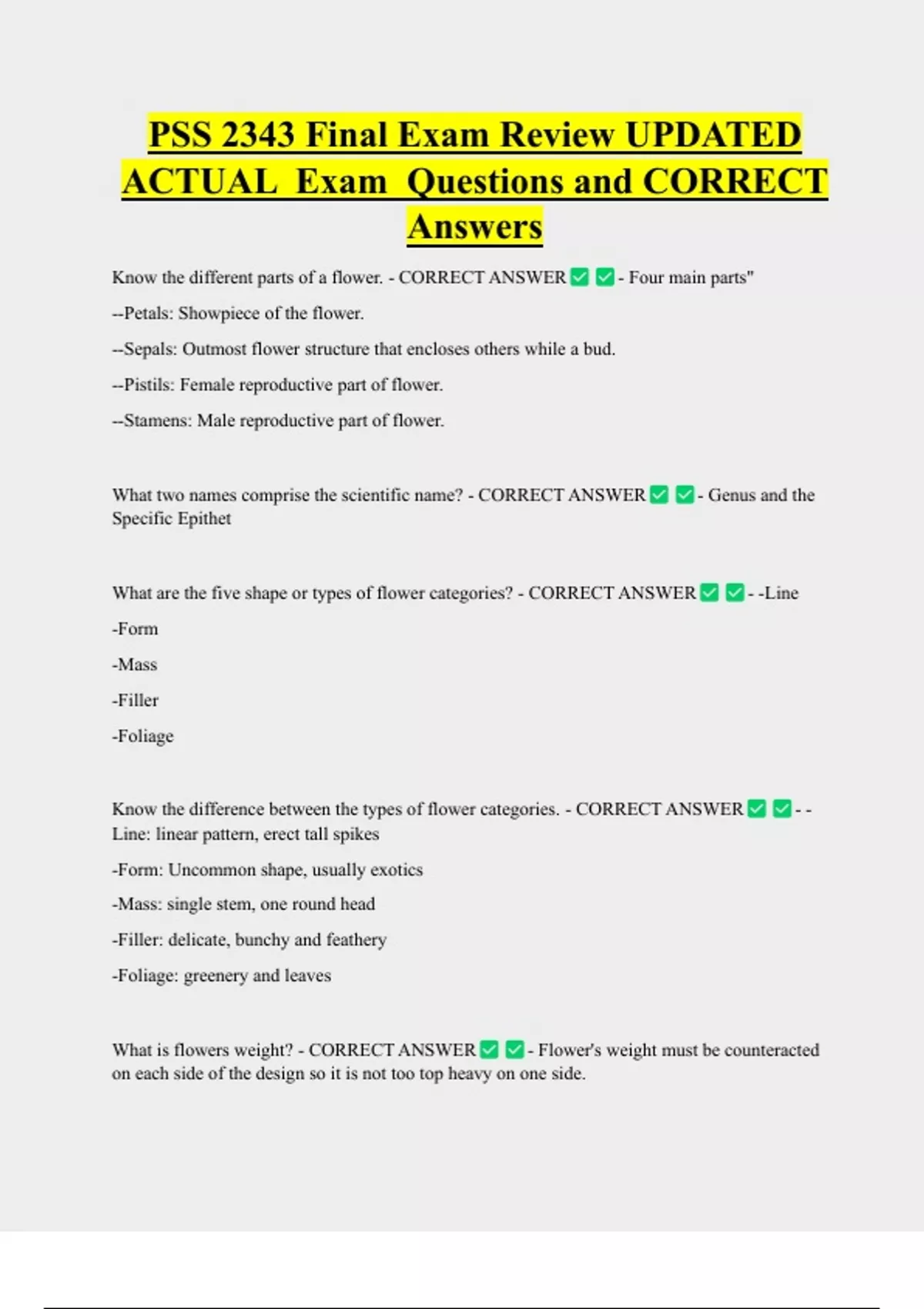 PSS 2343 Final Exam Review UPDATED ACTUAL Exam Questions and CORRECT Answers Know the different parts of a flower. - CORRECT ANSWER --Petals: Showpiece of the flower. --Sepals: Outmost flower structure that encloses others while a bud. --Pistils: Female reproductive part of flower. --Stamens: Male reproductive part of flower. - Four main parts" What two names comprise the scientific name? - CORRECT ANSWER Specific Epithet What are the five shape or types of flower categories? - CORRECT ANSWER -Form -Mass -Filler -Foliage - Genus and th