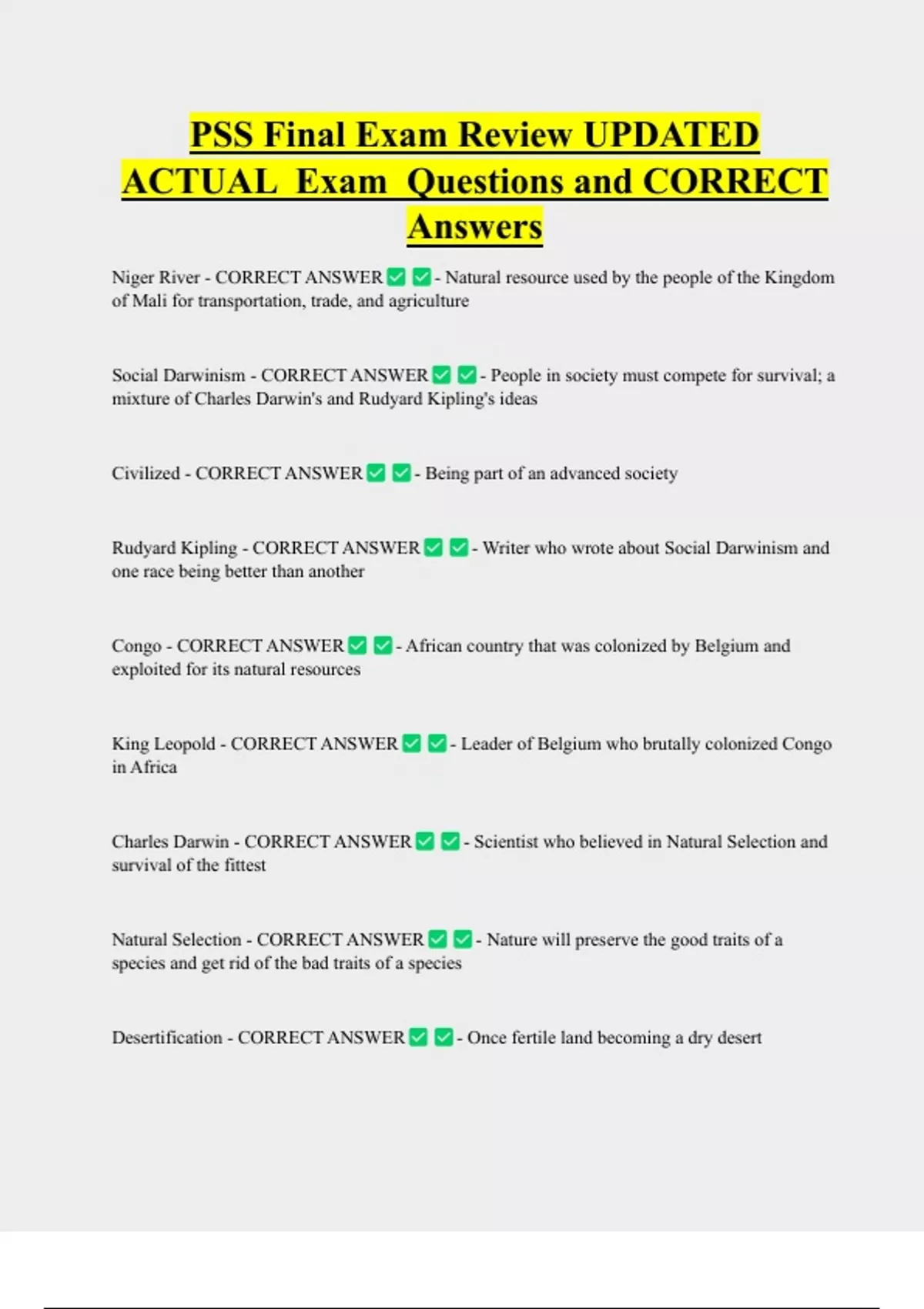 PSS Final Exam Review UPDATED ACTUAL Exam Questions and CORRECT Answers Niger River - CORRECT ANSWER - Natural resource used by the people of the Kingdom of Mali for transportation, trade, and agriculture Social Darwinism - CORRECT ANSWER - People in society must compete for survival; a mixture of Charles Darwin's and Rudyard Kipling's ideas Civilized - CORRECT ANSWER - Being part of an advanced society