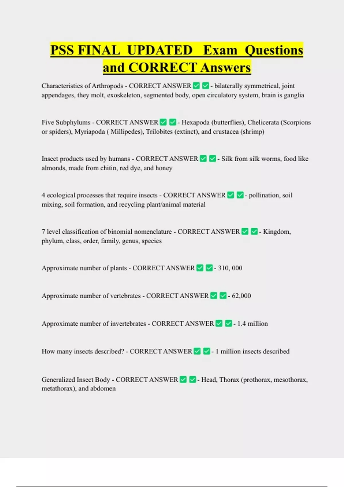 PSS FINAL UPDATED Exam Questions and CORRECT Answers Characteristics of Arthropods - CORRECT ANSWER - bilaterally symmetrical, joint appendages, they molt, exoskeleton, segmented body, open circulatory system, brain is ganglia Five Subphylums - CORRECT ANSWER - Hexapoda (butterflies), Chelicerata (Scorpions or spiders), Myriapoda ( Millipedes), Trilobites (extinct), and crustacea (shrimp) Insect products used by humans - CORRECT ANSWER almonds, made from chitin, red dye, and honey - Silk from silk worms, food lik