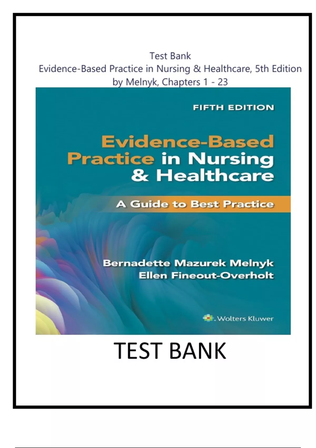 Evidence-Based Practice in Nursing & Healthcare, 5th Edition by Melnyk Test Bank Stuvia Is Available For Download After Purchase. In Case You Encounter Any Difficulties with Download or want the document in a Different Format, Please Feel Free to Contact Me via Inbox. I Will Promptly Sort You. Thank You Test Bank For Evidence-Based Practice in Nursing & Healthcare, 5th Edition by Melnyk is your ultimate study companion, designed to help you succeed in your nursing and healthcare courses. Whether you're preparing for exams or deepening your understanding of evidence-based practice, this test bank provides a reliable resource to reinforce your learning. You’ll find content that complements the key concepts in your textbook, ensuring you're well-prepared for assessments. This nursing test bank aligns closely with Evidence-Based Practice in Nursing and gives you access to practice questions tailored to the 5th Edition by Melnyk. It’s an excellent tool for exam prep, offering focused material for the topics covered in the course. If you're looking to download a test bank for Evidence-Based Practice in Healthcare, this is the resource that meets your needs. With the Evidence-Based Practice Melnyk 5th Edition test bank, you can approach your studies confidently and effectively.