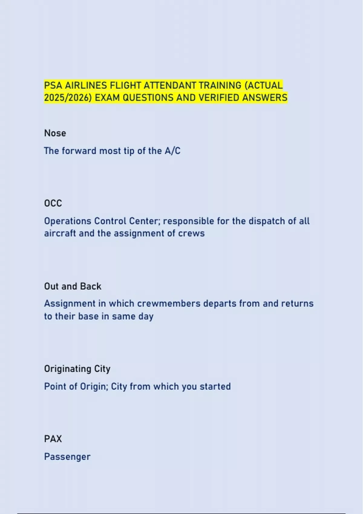 PSA AIRLINES FLIGHT ATTENDANT TRAINING (ACTUAL 2025/2026) EXAM QUESTIONS AND VERIFIED ANSWERS