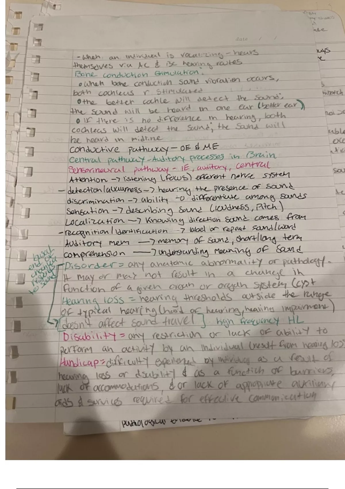 overview of the central auditory system, notes on bone conduction. in depth notes on sensory neural pathways. difference of disability and handicap