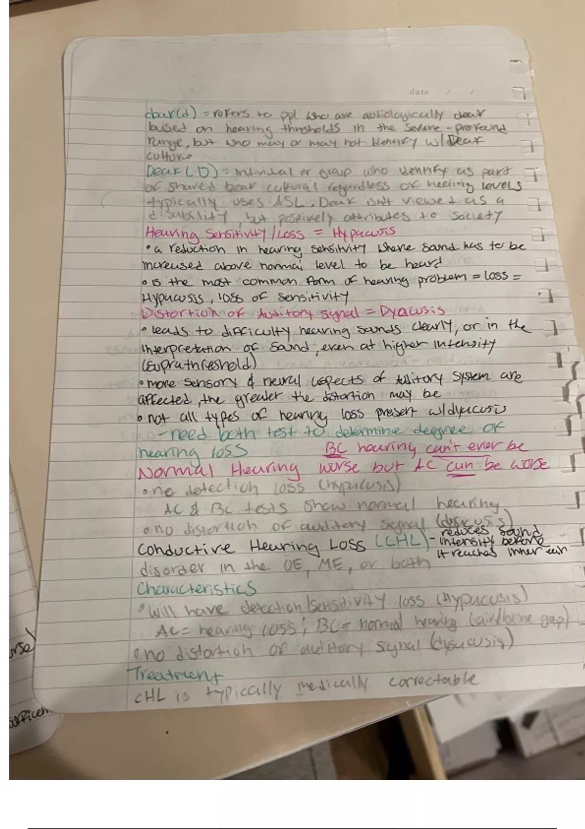 notes on deaf and Deaf. dyacusis and hypacusis (hearing loss). normal hearing and condcutive details.