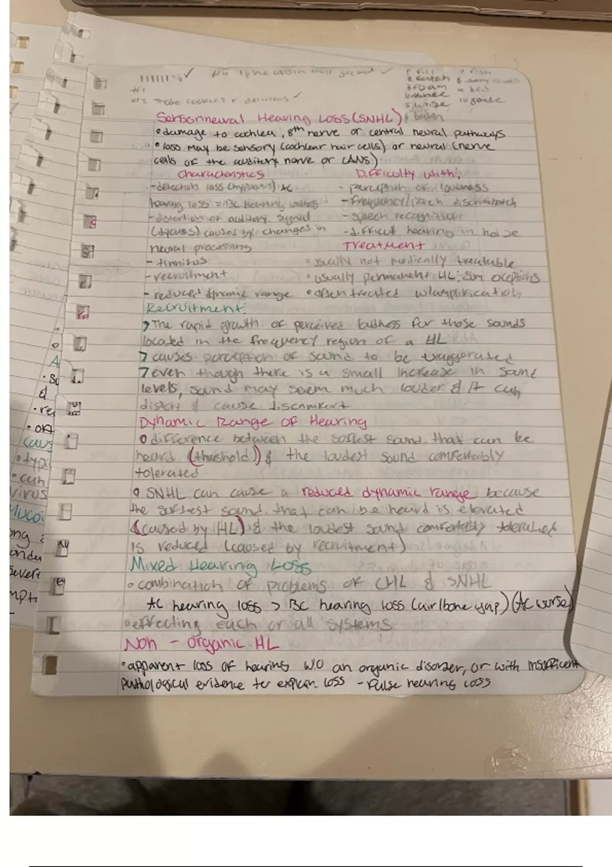 These notes provide details on sensorineural hearing loss with the characteristics, diffciulties, and treatments. Information on dynamic hearing loss, and organic hearing loss.