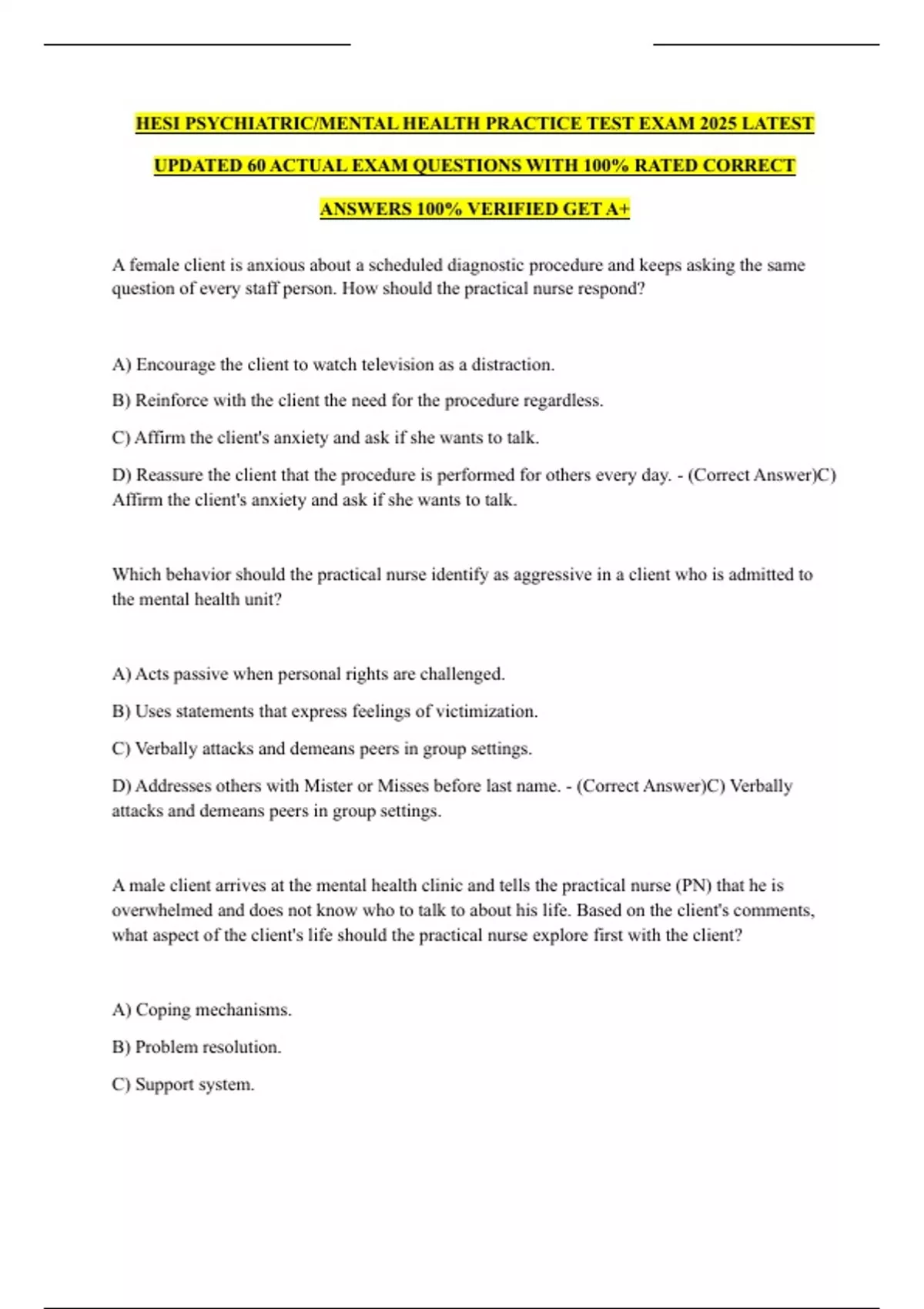 A male client arrives at the mental health clinic and tells the practical nurse (PN) that he is
