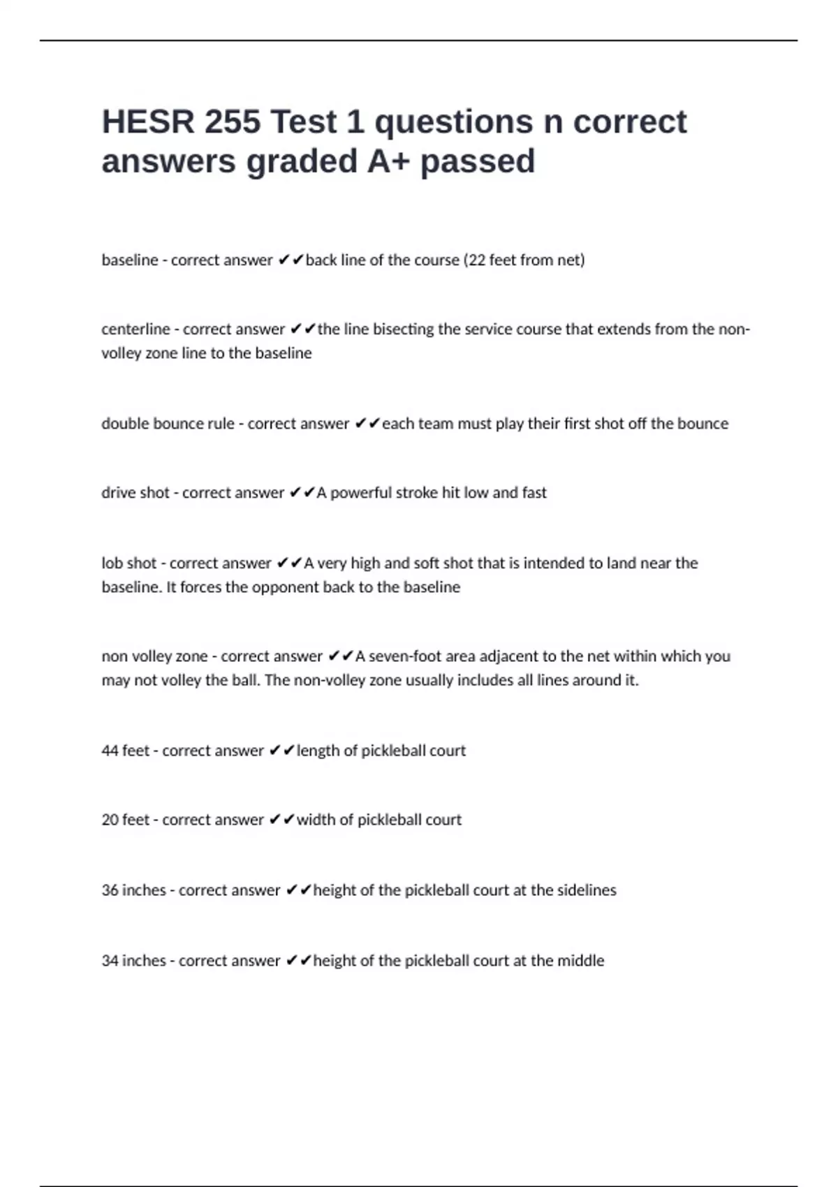 36 inches - correct answer ✔✔height of the pickleball court at the sidelines