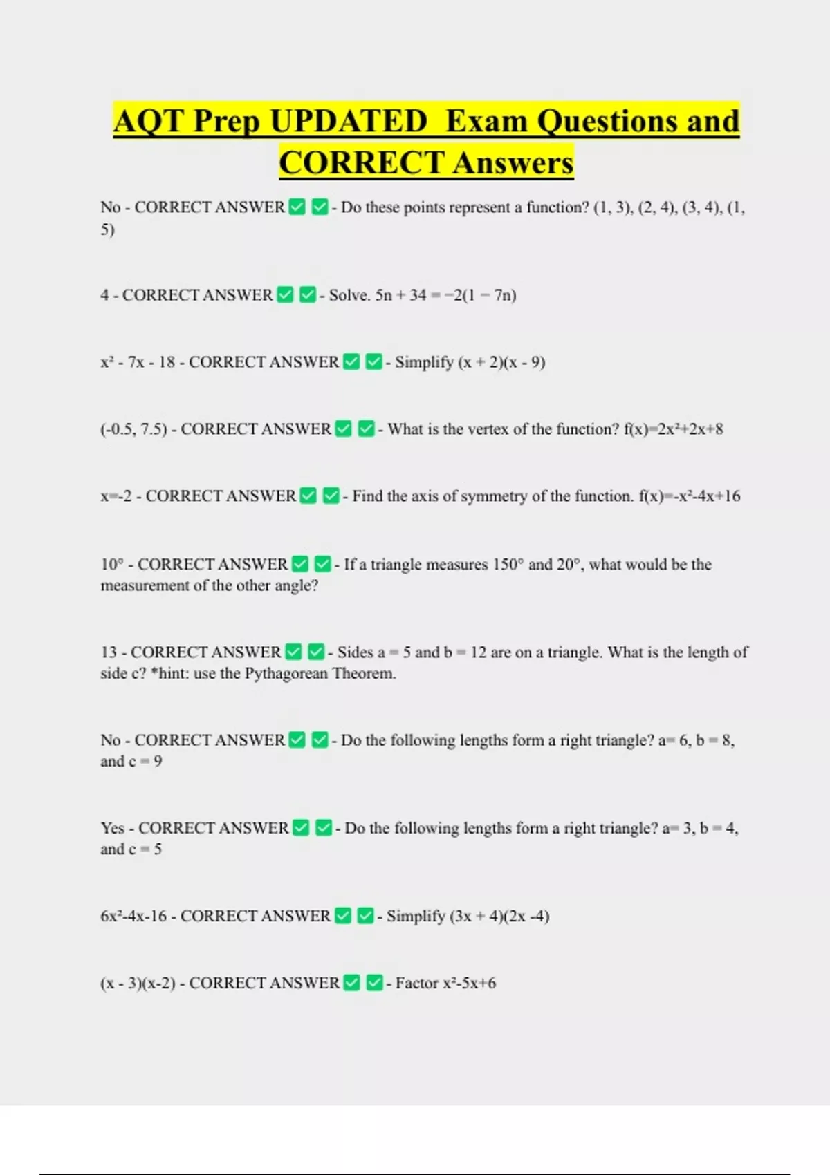 AQT Prep UPDATED Exam Questions and CORRECT Answers No - CORRECT ANSWER 5) 4 - CORRECT ANSWER - Do these points represent a function? (1, 3), (2, 4), (3, 4), (1, - Solve. 5n + 34 = −2(1 − 7n) x² - 7x - 18 - CORRECT ANSWER (-0.5, 7.5) - CORRECT ANSWER x=-2 - CORRECT ANSWER 10° - CORRECT ANSWER - Simplify (x + 2)(x - 9) - What is the vertex of the function? f(x)=2x²+2x+8