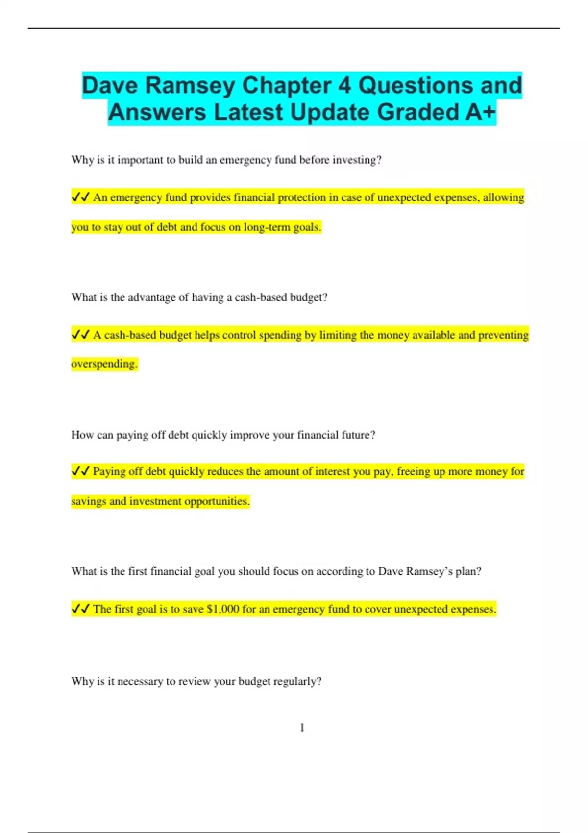 Dave Ramsey Chapter 4 Questions and Answers Latest Update Graded A+ Why is it important to build an emergency fund before investing? An emergency fund provides financial protection in case of unexpected expenses, allowing you to stay out of debt and focus on long-term goals. What is the advantage of having a cash-based budget? A cash-based budget helps control spending by limiting the money available and preventing overspending. How can paying off debt quickly improve your financial future? Paying off debt quickly reduces the amount of interest you pay, freeing up more money for savings and investment opportunities. What is the first financial goal you should focus on according to Dave Ramsey’s plan? The first goal is to save $1,000 for an emergency fund to cover unexpected expenses. Why is it necessary to review your budget regularly? 2 Reviewing your budget regularly helps you stay on track, adjust for changes in income or expenses, and ensure you meet your financial goals. How does focusing on paying off debt help with achieving financial freedom? Paying off debt removes financial obligations, allowing you to direct more of your money toward building wealth and savings. Why should you create a written financial plan? A written financial plan provides clarity, direction, and helps you stay disciplined in managing your finances. What is the benefit of living on less than you make? Living on less than you make allows you to save, avoid debt, and invest for the future, ensuring long-term financial stability. Why is it important to have a plan for large, predictable expenses like holidays or vacations? Having a plan ensures that you save in advance for these expenses, preventing you from using credit or going into debt. 3 How does cutting back on discretionary spending help with paying off debt? Cutting back on discretionary spending frees up more money that can be directed toward paying off debt, speeding up the process. What does it mean to “live like no one else now so later you can live like no one else”? It means making sacrifices and prioritizing savings and debt elimination now, so you can enjoy financial freedom and success later. What should you do with your emergency fund once it’s fully funded? Once your emergency fund is fully funded, you can focus on paying off all your debt and then saving for other goals, like retirement or a home. Why is it essential to build wealth over time rather than