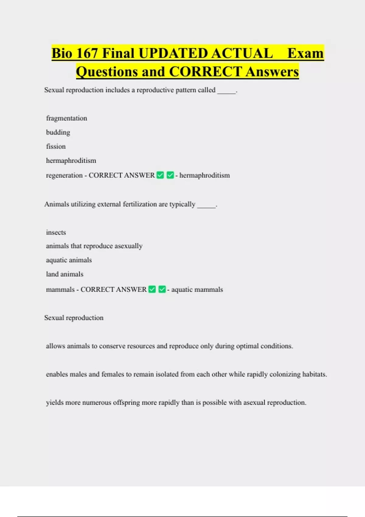 Bio 167 Final UPDATED ACTUAL Exam Questions and CORRECT Answers Sexual reproduction includes a reproductive pattern called _____. fragmentation budding fission hermaphroditism regeneration - CORRECT ANSWER - hermaphroditism Animals utilizing external fertilization are typically _____