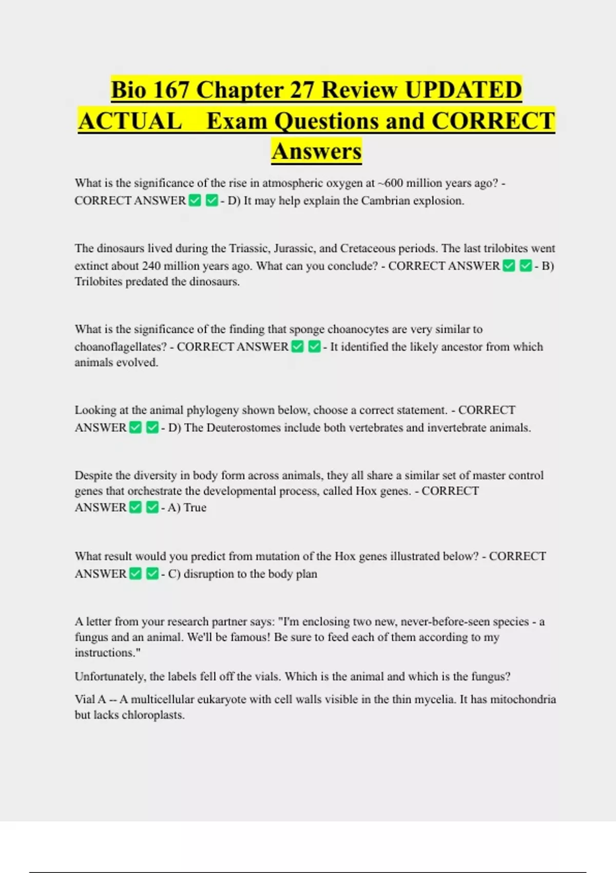 Bio 167 Chapter 27 Review UPDATED ACTUAL Exam Questions and CORRECT Answers What is the significance of the rise in atmospheric oxygen at ~600 million years ago? - CORRECT ANSWER - D) It may help explain the Cambrian explosion. The dinosaurs lived during the Triassic, Jurassic, and Cretaceous periods. The last trilobites went extinct about 240 million years ago. What can you conclude? - CORRECT ANSWER Trilobites predated the dinosaurs