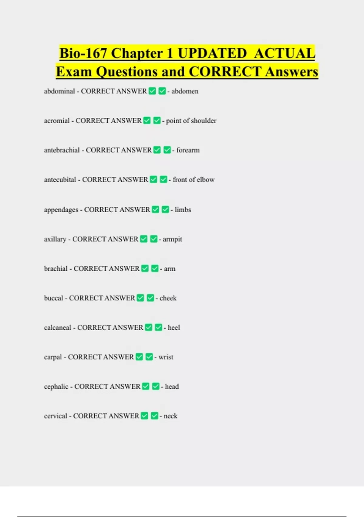 Bio-167 Chapter 1 UPDATED ACTUAL Exam Questions and CORRECT Answers abdominal - CORRECT ANSWER acromial - CORRECT ANSWER antebrachial - CORRECT ANSWER antecubital - CORRECT ANSWER appendages - CORRECT ANSWER axillary - CORRECT ANSWER brachial - CORRECT ANSWER buccal - CORRECT ANSWER calcaneal - CORRECT ANSWER carpal - CORRECT ANSWER cephalic - CORRECT ANSWER cervical - CORRECT ANSWER - abdomen - point of shoulder - forearm - front of elbow