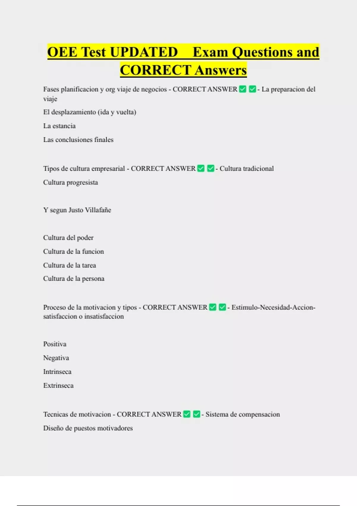 OEE Test UPDATED Exam Questions and CORRECT Answers Fases planificacion y org viaje de negocios - CORRECT ANSWER viaje El desplazamiento (ida y vuelta) La estancia Las conclusiones finales Tipos de cultura empresarial - CORRECT ANSWER - La preparacion del - Cultura tradicion