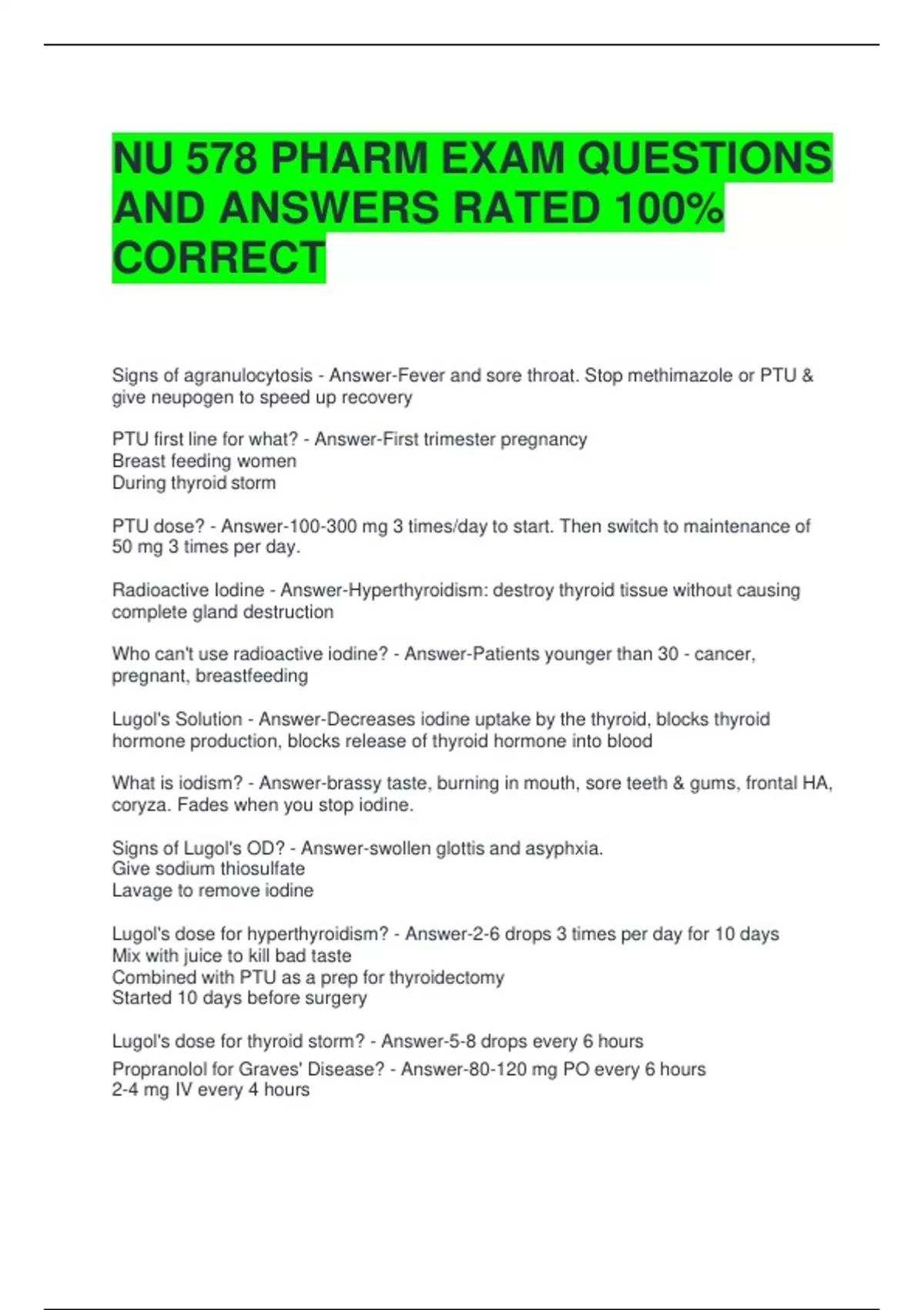 NU 578 PHARM EXAM QUESTIONS AND ANSWERS RATED 100 CORRECT