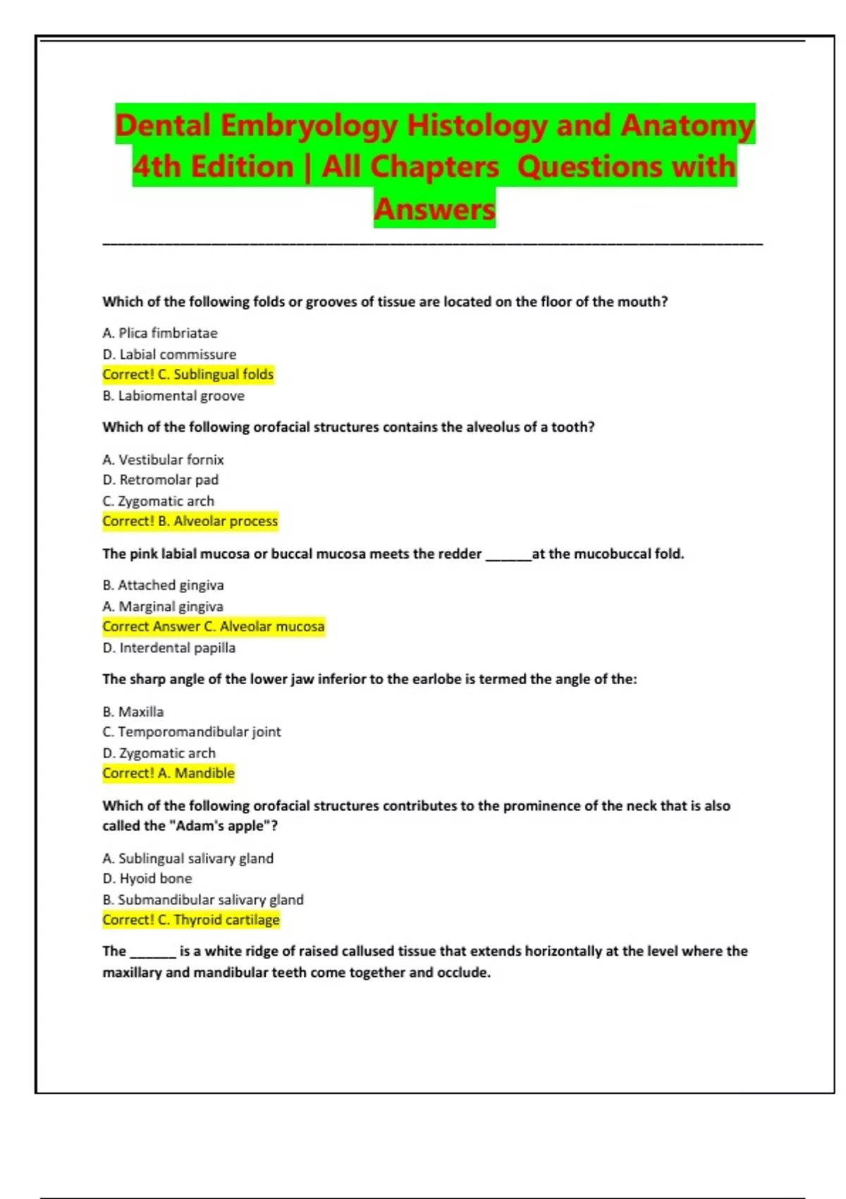 Dental Embryology Histology and Anatomy 4th Edition | All Chapters Questions with Answers